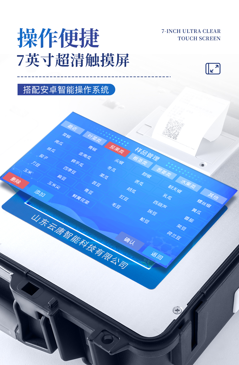 | 主控芯片采用ARM Cortex-A7,RK3288/4核處理器,主頻1.88Ghz,運(yùn)轉(zhuǎn)速度更快速,穩(wěn)定性更強(qiáng)。 | 12個(gè)檢測(cè)通道,可批量快速多樣品檢測(cè), | 顯示方式:7英寸液晶觸摸屏顯示,人性化中文操作界面,讀數(shù)直觀、簡(jiǎn)單。 | 交直流兩用,配有6ah大容量充電鋰電池,方便戶外流動(dòng)測(cè)試,直流12V供電,可連接車載電源。 | 智能恒流穩(wěn)壓,光強(qiáng)自動(dòng)調(diào)節(jié)與校準(zhǔn),長(zhǎng)時(shí)間連續(xù)工作光源無溫漂現(xiàn)象。 | 樣本編號(hào)自動(dòng)累加。 | 數(shù)據(jù)無線上傳平臺(tái),并可從平臺(tái)導(dǎo)出為Excel表格。 | 檢測(cè)結(jié)果存儲(chǔ)容量20萬條 | 同時(shí)支持U盤拷貝,標(biāo)準(zhǔn)USB接口,免驅(qū)動(dòng)插拔。 | 檢測(cè)項(xiàng)目可擴(kuò)充,固件可升級(jí) | 儀器尺寸:43×35×19cm, 主機(jī)凈重:5.2kg |