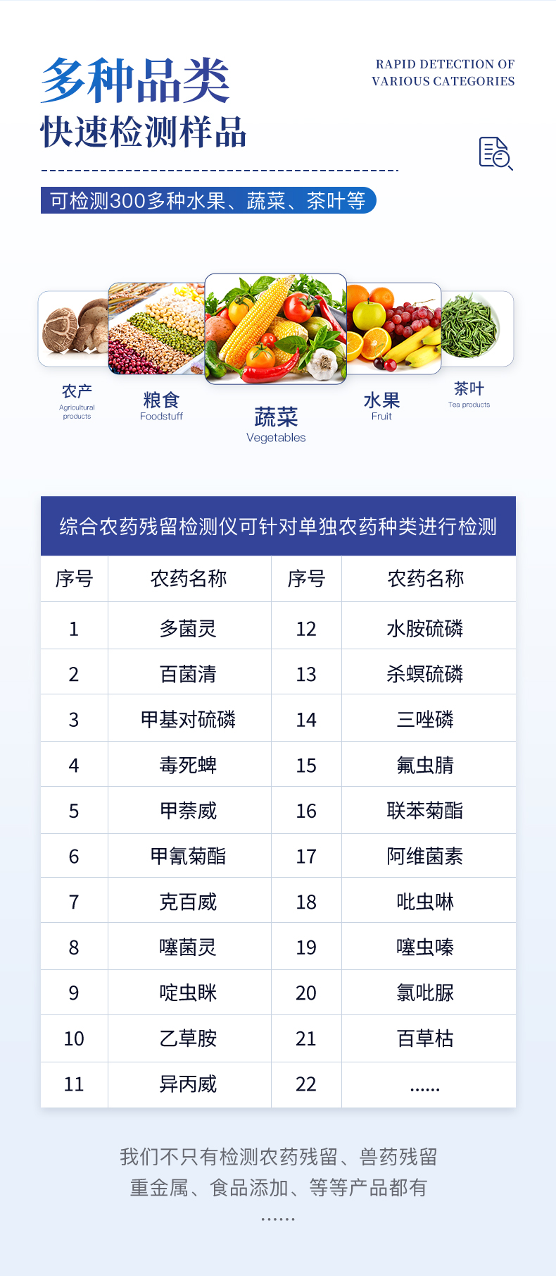 綜合農(nóng)藥殘留檢測(cè)儀,除了遵循國(guó)標(biāo)對(duì)有機(jī)磷和氨基甲酸酯類農(nóng)藥進(jìn)行檢測(cè)外,還可以針對(duì)具體農(nóng)藥進(jìn)行分項(xiàng)準(zhǔn)確檢測(cè),包含吡蟲啉、噻蟲嗪、多菌靈、百菌清、克百威、毒死蜱、異丙威、啶蟲脒、氟蟲腈、水胺硫磷、甲萘威、三唑磷、百草枯、甲霜靈、殺螟硫磷、百菌清-多菌靈2合1、氟蟲腈-甲萘威2合1、甲基對(duì)硫磷、乙草胺、阿維菌素、有機(jī)磷、甲草胺、涕滅威、噻菌靈、三唑酮、氯吡脲、多效唑、氯噻啉、霜霉威、噻蟲啉、辛硫磷、苯醚甲環(huán)唑、4-氯苯氧乙酸、2,4-二氯苯氧乙酸、2,4,5-三氯苯氧乙酸、6-芐基腺嘌呤、除草定、烯啶蟲胺、異菌脲、氟苯脲、腐霉利、甲氰菊酯、**氯氟氰菊酯、二甲戊靈、氟節(jié)甲基異柳磷、噠螨靈、噻蟲胺、烯酰嗎啉、嘧菌酯、氟樂靈、嘧霉胺、三唑酮/三唑醇、滅蠅胺、戊唑醇、甲拌磷、氯蟲苯甲酰胺、二嗪磷、氧樂果、甲基吡啶磷、阿滅丁、雙甲脒等眾多殺蟲劑化合物。