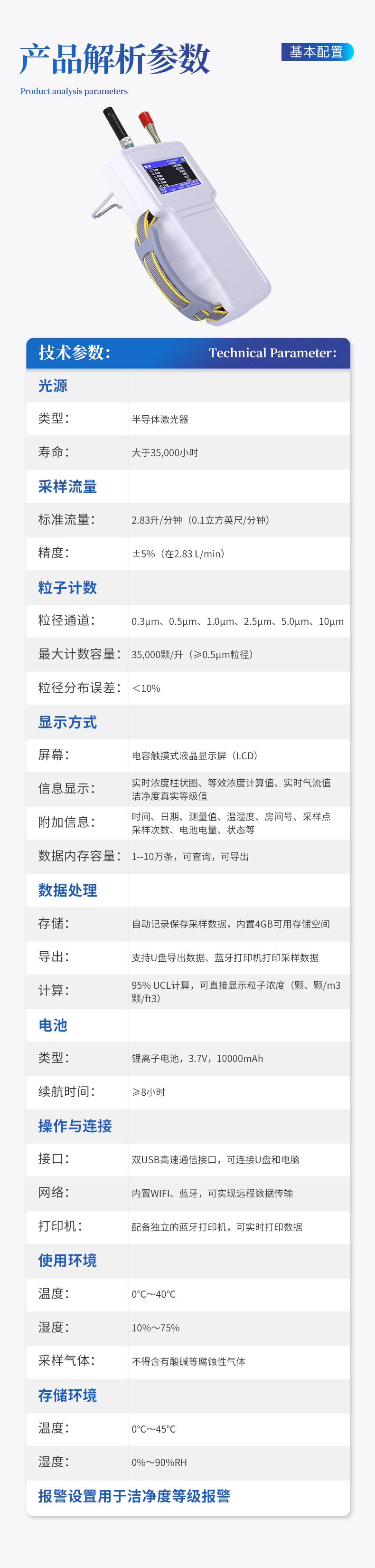 粒徑通道:0.3μm、0.5μm、1.0μm、2.5μm、5.0μm、10μm **計(jì)數(shù)容量:35,000顆/升(≥0.5μm粒徑) 重復(fù)性相對誤差:<10% 粒徑分布誤差:0.5μm粒徑擋分布誤差±30% |