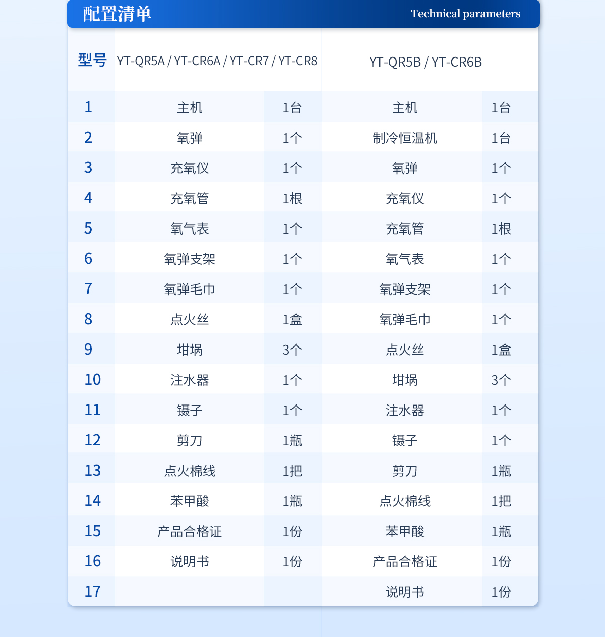 | 主機(jī) 1臺(tái) | 制冷恒溫機(jī) 1臺(tái) | 氧彈 1個(gè) | 充氧儀 1個(gè) | 充氧管 1根 | 氧氣表 1個(gè) | 氧彈支架 1個(gè) | 氧彈毛巾 1個(gè) | 點(diǎn)火絲 1盒 | 坩堝 3個(gè) | 注水器 1個(gè) | 鑷子 1個(gè) | 剪刀 1瓶 | 點(diǎn)火棉線 1把 | 苯甲酸 1瓶 | 產(chǎn)品合格證 1份 | 說明書 1份 |