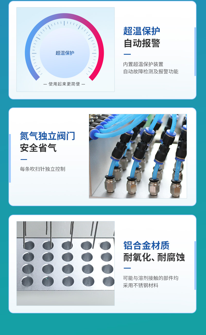 | 分配室上各氣針通道可組合使用或單獨使用,每一路氣針均可單獨開關。分配室的高度可視需要調節。 | 每一路氣體流量可單獨進行調節,克服了不可調氮吹儀各氣路氣流量大小不一的弱點。 | 數字溫控器,雙數字顯示. | 可能與溶劑接觸的部件均采用不銹鋼材料、合金鋁并表面進行塑料噴涂,使用壽命長且清潔方便。 | 整機可放入通風櫥中使用。 | 一般標配的加熱塊規格為孔徑∮16mm。 |