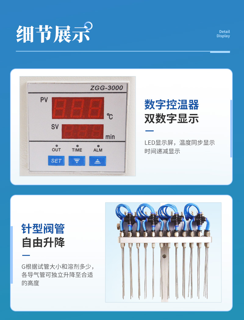 | 每個吹針都可以獨立控制,避免引起交叉污染。 | 儀器氣腔高度可以自行調節,配備標準氣針長度為15厘米。 | 氮吹儀有36個氣道控制開關,節約氣體,每根吹氣針的位置可獨立改變吹掃位置,使之適用不同的樣品容器及不同的樣品位置 | 在濃縮有毒溶劑時,整個系統可置于通風柜中,降低危險。 | 內置超溫保護裝置,自動故障檢測及報警功能,方便實用。 | 儀器有LED顯示屏,溫度同步顯示、時間遞減顯示,可時時觀察溫度變化。 | 具有整體溫度更均勻,加熱速度快 | 本產品還可以作為普通的干式恒溫器使用 | 使用起來更簡便,而且溫度也可以達到150℃,可以更好濃縮樣品 |