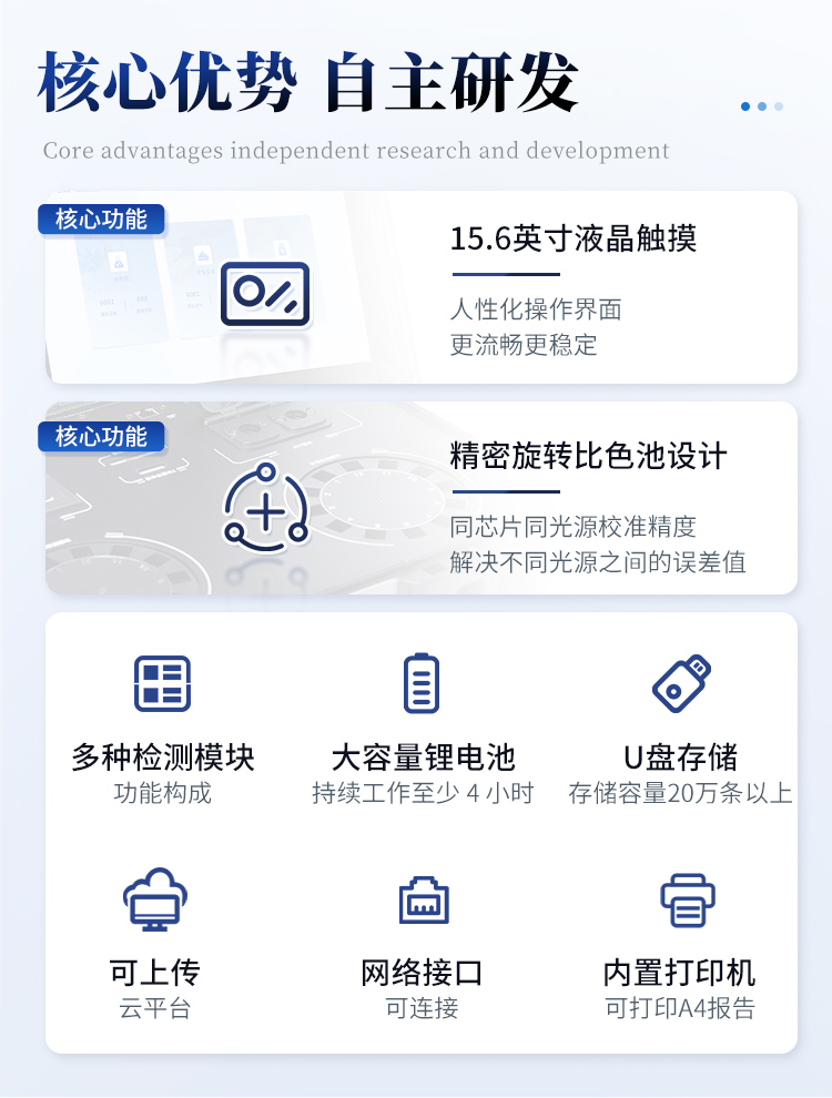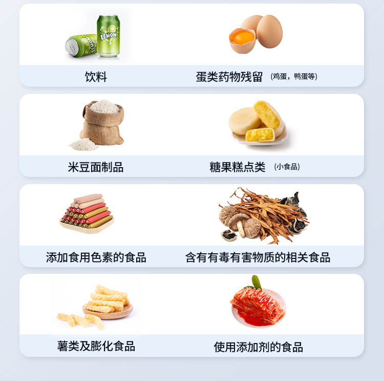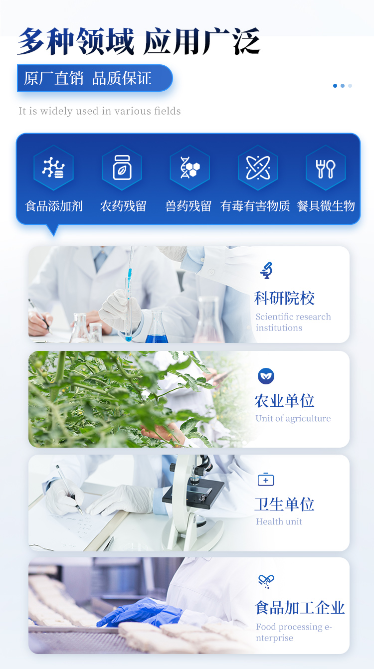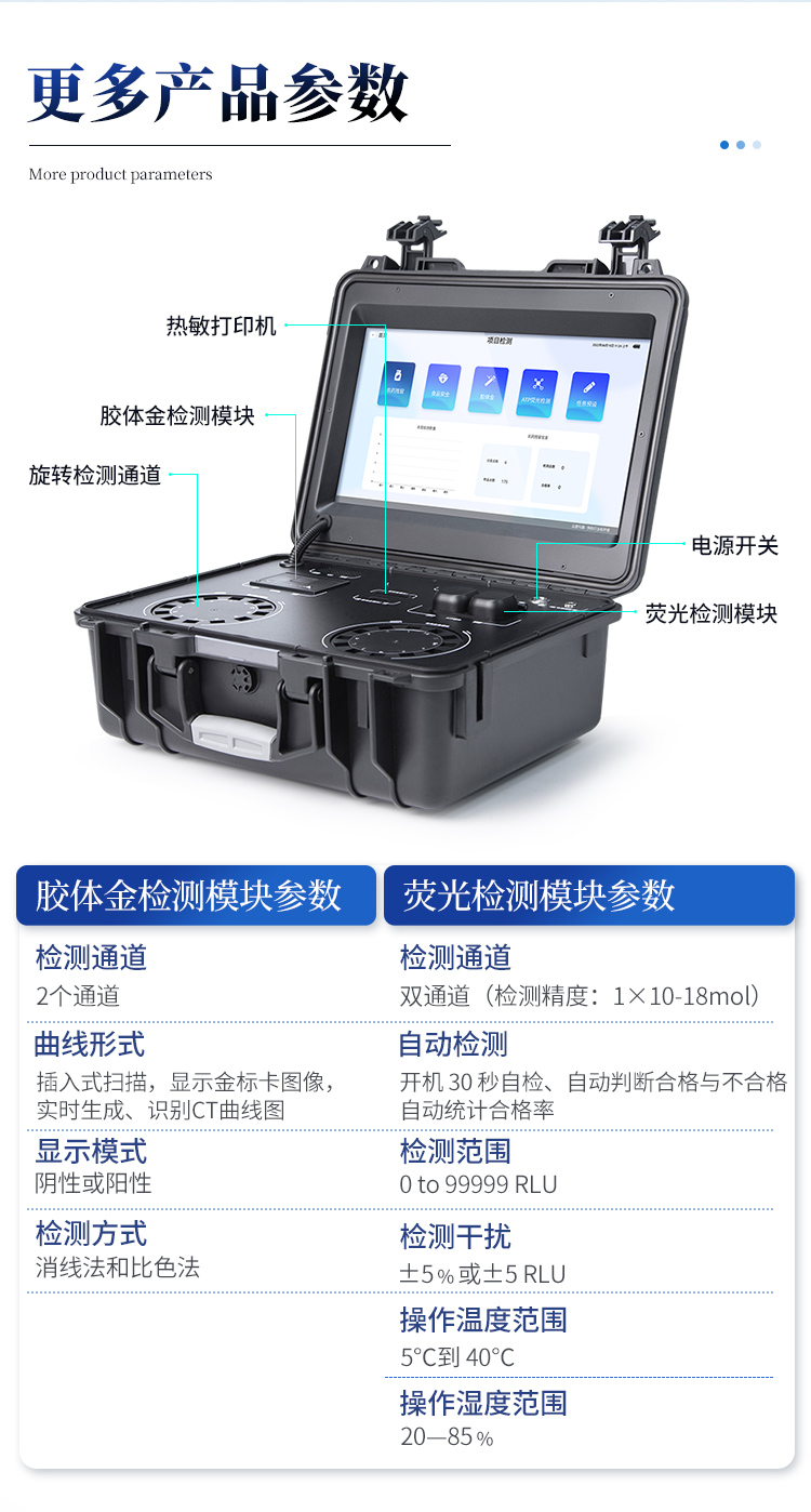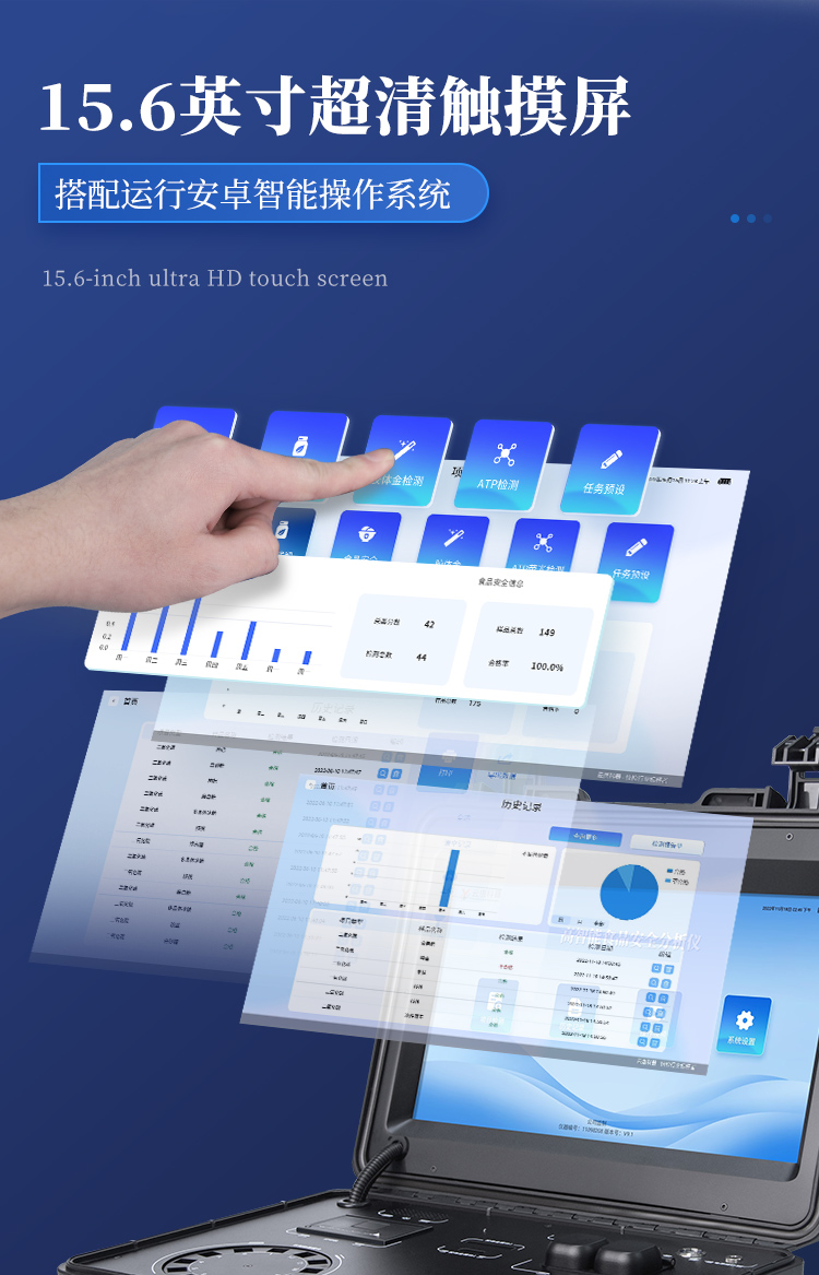 | 1. 功能構(gòu)成:主要包括分光光度模塊、新型農(nóng)殘檢測模塊、膠體金檢測模塊、熒光檢測模塊、數(shù)字化管理模塊等,所有模塊集成一體,可快速檢測200多種食品安全項目,如獸藥殘留、農(nóng)藥殘留、非法添加劑、細(xì)菌數(shù)值等指標(biāo)。 | 2. 檢測樣品種類:餐具及廚房用品、瓜果蔬菜及其制品、水產(chǎn)品及其制品、畜禽產(chǎn)品及其制品、嬰幼兒乳品及奶粉制品、蜂蜜、糧油及其制品、調(diào)味品(食醋、醬油、味精、鹽等)、酒類茶葉及其制品、食用菌、飲料、蛋類藥物殘留(雞蛋,鴨蛋等)、米豆面制品、糖果糕點類(小食品)、薯類及膨化食品、瓶(桶)裝飲用水、添加食用色素的食品、使用添加劑的食品、含有有毒有害物質(zhì)的相關(guān)食品。 | 3、顯示屏幕:儀器采用15.6英寸液晶觸摸屏顯,搭配運(yùn)行安卓智能操作系統(tǒng),主控芯片采用ARM Cortex-A7,RK3288/4核處理器,主頻1.88Ghz,操作方便,性能更強(qiáng)。 | 4、供電模式:儀器交直流兩用,直流12V供電,可連接車載電源,配18ah大容量充電鋰電池,電量可實時顯示,無外部電源條件下可持續(xù)工作至少 4 小時。 | 5、檢測通道:≥24通道;采用精密旋轉(zhuǎn)比色池設(shè)計,使用同芯片同光源校準(zhǔn)精度,解決不同光源之間的誤差值,更加準(zhǔn)確**,采用高精度進(jìn)口四波長冷光源,每個通道均配置 410、520、590、630nm 波長光源,標(biāo)配**的光路切換裝置,專利光路切換功能可實現(xiàn)64波長,并且所有檢測項目可實現(xiàn)所有通道同時檢測. | 6、通訊接口:配備無線通信模塊、4G(APN)通訊模塊、藍(lán)牙傳輸,同時具有雙USB接口以及RJ45網(wǎng)線接口,可以多方式實現(xiàn)數(shù)據(jù)保存及數(shù)據(jù)傳輸。 | 7、存儲方式:支持U盤存儲,兩個標(biāo)準(zhǔn)USB接口,免驅(qū)動安裝。檢測結(jié)果存儲容量20萬條以上,可生成Excel表格進(jìn)行拷貝,并具有登錄保護(hù)功能。 | 8、操作系統(tǒng):儀器可在同一檢測界面自動對應(yīng)相關(guān)檢測通道,一次性選擇不少于11個樣品名稱,無需退出界面,節(jié)省操作時間。并可以對每個通道屬性和樣品信息單獨進(jìn)行編輯,例如送檢單位、人員,檢測人員等,打印時勾選打印顯示。 | 9、數(shù)據(jù)集成系統(tǒng):設(shè)備首頁自動匯總分析檢測數(shù)據(jù),包含:周檢測數(shù)據(jù)、月檢測數(shù)據(jù),全部檢測總數(shù)量,包含檢測總數(shù),合格數(shù),不合格數(shù),以及相關(guān)柱形分析圖,各項檢測數(shù)據(jù)一目了然,無需電腦查詢,更加快捷直觀。 | 10、數(shù)據(jù)庫系統(tǒng):十幾項數(shù)據(jù)庫分類管理儀器:包含項目類型、項目數(shù)據(jù)、檢測數(shù)據(jù)、歷史記錄、國標(biāo)信息、曲線信息、采樣信息、檢測信息、受檢信息、復(fù)核信息、圖表信息、光源校準(zhǔn)信息、打印樣式信息、樣品庫信息等等,數(shù)據(jù)庫之間互相協(xié)調(diào)聯(lián)動保證數(shù)據(jù)的真實完整性。同時產(chǎn)品數(shù)據(jù)庫以及歷史檢測記錄支持一鍵檢索功能。 | 11、限量規(guī)判系統(tǒng):具有限量查詢、添加物質(zhì)合規(guī)判定系統(tǒng)。檢測出結(jié)果后,系統(tǒng)自動調(diào)用系統(tǒng)數(shù)據(jù)庫中相關(guān)國標(biāo)進(jìn)行比對判定,客觀顯示判定結(jié)果是否合格。 | 12、項目預(yù)設(shè)系統(tǒng):儀器具有任務(wù)預(yù)設(shè)模塊,一鍵提前預(yù)設(shè),給出方便快捷的新檢測方案,每一個任務(wù)分別可以設(shè)置不同的樣品、批次、編號、來源、備注、抽樣信息、檢測信息、受檢信息、復(fù)核信息等更多信息。樣品送檢時一鍵調(diào)取保存信息,并可多次調(diào)取,適用于大批量檢測業(yè)務(wù),可以大大提高檢測效率。 | 13、數(shù)據(jù)監(jiān)管系統(tǒng):同步對接監(jiān)管平臺,數(shù)據(jù)可局域網(wǎng)和互聯(lián)網(wǎng)數(shù)據(jù)上傳,檢測結(jié)果可直接傳至食品安全監(jiān)管平臺。進(jìn)行區(qū)域食品安全監(jiān)管及大數(shù)據(jù)分析處理與數(shù)據(jù)統(tǒng)計,監(jiān)測區(qū)域食品安全長短期動態(tài)及問題預(yù)估、預(yù)警。 | 14.1、全新打印系統(tǒng):內(nèi)置全新打印機(jī),新創(chuàng)自定義打印方式,可按需靈活勾選控制:產(chǎn)品合格證(國家農(nóng)業(yè)部標(biāo)準(zhǔn)要求),二維碼,抽樣信息、檢測信息,受檢信息、復(fù)核信息、抽樣日期、檢測日期等信息的打印。 | 14.2、A4紙版本報告打印功能:設(shè)備擁有兩種結(jié)果展示方式,可以自動生成A4打印模板和小票打印模板兩種樣式,可通過WiFi及網(wǎng)線等方式連接外置打印機(jī)可進(jìn)行打印。 | 15、膠體金檢測模塊:采用單通道CMOS成像處理技術(shù)及膠體金免疫層析技術(shù),可讀取膠體金卡數(shù)據(jù),自動采集、處理分析,將檢測結(jié)果顯示,并可根據(jù)參考限值自動判斷檢測結(jié)果,可檢測常見的獸藥殘留、生物毒素、抗生素、違禁添加物等。 | 15.1、可即時檢測單聯(lián)卡及三聯(lián)卡; | 15.2、檢測通道:2個通道; | 15.3、檢測方式:消線法和比色法; | 15.4、顯示模式:陰性或陽性; | 15.5、曲線形式:插入式掃描方式,顯示金標(biāo)卡圖像,實時生成、識別CT曲線圖,無需手動調(diào)整。兼容市場上其他金標(biāo)卡,使用耗材不受限制。 | 16、熒光檢測模