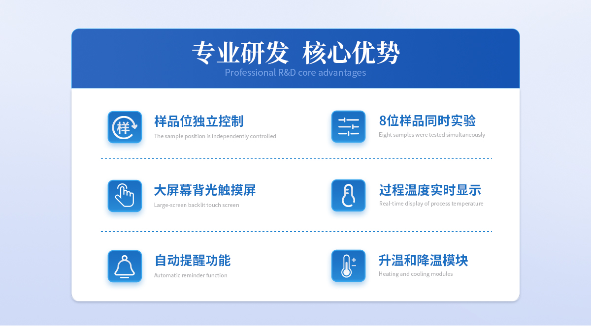 | ◆ 全樣品位:8位, | ◆ 樣品位可獨立控制:每個樣品位獨立控制,*多實現8位樣品同時實驗。 | ◆ 恒溫控制功能:**的升溫和降溫模塊,自動控制實驗操作在恒溫25℃下進行,實驗過程溫度實時顯示。 | ◆ 測量提醒功能:到達檢測條件后自動提醒功能,保證每次實驗的及時進行。 | ◆ 控溫精度:25℃±1℃ | ◆ 大屏幕背光觸摸屏,方便直觀操作。 |