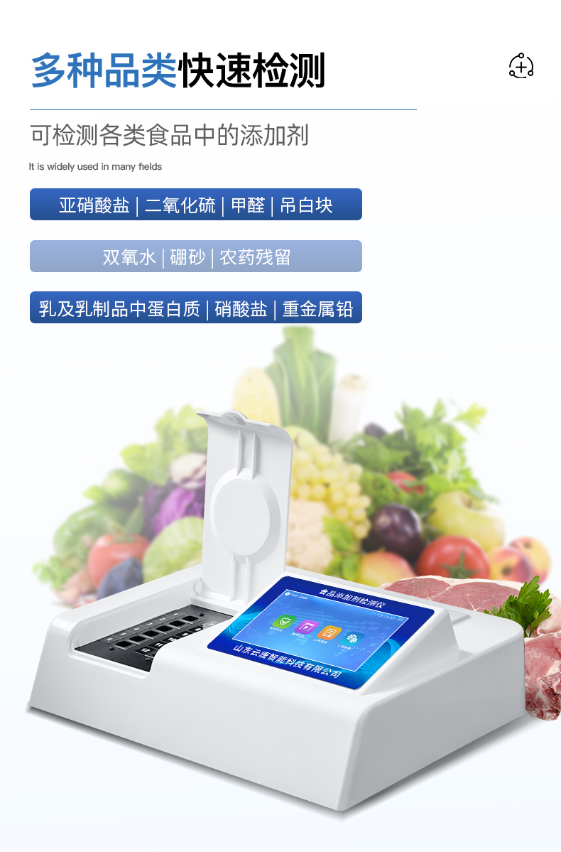 | 儀器采用臺式一體化系統(tǒng)檢測技術(shù),將分光光度模塊、數(shù)字化管理模塊、無線通訊模塊高度集成于一體,可支持檢測60種食品安全檢測項目,同時預(yù)留升級檢測方法。 | 儀器檢測模塊標(biāo)準(zhǔn)化、智能化,檢測項目可隨意自由組合。檢測箱體內(nèi)置多個標(biāo)準(zhǔn)檢測單元,檢測模塊可以調(diào)整配置。 | 顯示屏幕:儀器采用10.1英寸液晶觸摸屏顯,搭配運行安卓智能操作系統(tǒng),主控芯片采用ARM Cortex-A7,RK3288/4核處理器,主頻1.88Ghz,運轉(zhuǎn)速度更快速,性能更強(qiáng)。 | 檢測通道:≥12通道;采用精密旋轉(zhuǎn)比色池設(shè)計,使用光源芯片一致,可以解決各通道間由于光源芯片不同帶來的檢測結(jié)果誤差問題,檢測結(jié)果更加精準(zhǔn),1-12通道間誤差0.1%,***:**202022821055.2。 | 儀器光源:高精度進(jìn)口四波長冷光源,每個通道均配置 410、520、590、630nm 波長光源,標(biāo)配**的光路切換裝置,專利光路切換功能可實現(xiàn)*多64波長,并且所有檢測項目可實現(xiàn)所有通道同時檢測 | 設(shè)備具備開機(jī)自動校準(zhǔn)及一鍵校準(zhǔn)功能,確保檢測數(shù)據(jù)結(jié)果準(zhǔn)確。 | 通訊接口:配備無線通信模塊、4G(APN)通訊模塊、藍(lán)牙傳輸,同時具有雙USB接口以及RJ45網(wǎng)線接口,可以多方式實現(xiàn)數(shù)據(jù)保存及數(shù)據(jù)傳輸。 | 存儲方式:支持U盤存儲,標(biāo)準(zhǔn)USB接口,免驅(qū)動安裝。檢測結(jié)果存儲容量20萬條以上,可生成Excel表格進(jìn)行拷貝,并具有登錄保護(hù)功能。 | 智能化操作系統(tǒng): 操作系統(tǒng):可在同一檢測界面自動對應(yīng)相關(guān)檢測通道,一次性選擇1-12個樣品名稱,無需退出界面,節(jié)省操作時間。檢測通道可以分別打開與關(guān)閉并對檢測通道屬性和樣品信息進(jìn)行編輯,例如送檢單位、人員,檢測人員等,打印時一并顯示。 數(shù)據(jù)集成系統(tǒng):設(shè)備首頁自動統(tǒng)計檢測數(shù)據(jù),包含:周檢測數(shù)據(jù)、月檢測數(shù)據(jù),全部檢測總數(shù)量,均包含檢測總數(shù),合格數(shù),不合格數(shù),以及相關(guān)柱形分析圖,對各項檢測數(shù)據(jù)清晰掌握,無需電腦查詢,更加快捷直觀。 數(shù)據(jù)庫系統(tǒng):具有多品類多種類樣品菜單功能,并且構(gòu)建了完善的檢索、修訂功能。食品庫涵蓋多種菜單庫100多種蔬菜名稱,可按需添加或刪除、編輯蔬菜名稱;不同的檢測通道可同時檢測不同的樣品,產(chǎn)品數(shù)據(jù)庫以及歷史檢測記錄支持一鍵檢索功能。 限量規(guī)判系統(tǒng):具有限量查詢、添加物質(zhì)合規(guī)判定系統(tǒng)。檢測出結(jié)果后,系統(tǒng)自動調(diào)用系統(tǒng)數(shù)據(jù)庫中相關(guān)國標(biāo)進(jìn)行比對判定,客觀顯示判定結(jié)果是否合格。 項目預(yù)設(shè)系統(tǒng):儀器具有任務(wù)預(yù)設(shè)模塊,可在樣品送檢前提前預(yù)設(shè)樣品名稱、檢測指標(biāo)、送檢單位、檢測單位等信息,樣品送檢時一鍵調(diào)取保存信息,并可多次調(diào)取,大大提高檢測效率。 數(shù)據(jù)監(jiān)管系統(tǒng):同步對接監(jiān)管平臺,數(shù)據(jù)可局域網(wǎng)和互聯(lián)網(wǎng)數(shù)據(jù)上傳,檢測結(jié)果可選擇直接傳至食品安全監(jiān)管平臺。進(jìn)行區(qū)域食品安全監(jiān)管及大數(shù)據(jù)分析處理與數(shù)據(jù)統(tǒng)計,檢測區(qū)域食品安全長短期動態(tài),達(dá)到食品安全問題預(yù)估、預(yù)警。 自定義打印系統(tǒng):內(nèi)置熱敏打印機(jī);系統(tǒng)打印格式多樣化,產(chǎn)品合格證(國家農(nóng)業(yè)部標(biāo)準(zhǔn)要求),二維碼,抽樣信息、檢測信息,受檢信息、復(fù)核信息、抽樣日期、檢測日期等信息結(jié)果,可按實際需求自行設(shè)置開啟或關(guān)閉,并完成打印。 | 供電模式:儀器交直流兩用,直流12V供電,可連接車載電源,可配6ah大容量充電鋰電池,電量可實時顯示,方便戶外流動測試。 | 儀器具備遠(yuǎn)程升級功能,可定向分客戶分儀器更新,開機(jī)后自動更新,并可持續(xù)性免費更新系統(tǒng)版本,無需像傳統(tǒng)產(chǎn)品返廠更新,節(jié)省時間及人力成本并避免了物流運輸返廠升級導(dǎo)致設(shè)備損壞的潛在風(fēng)險。 |
