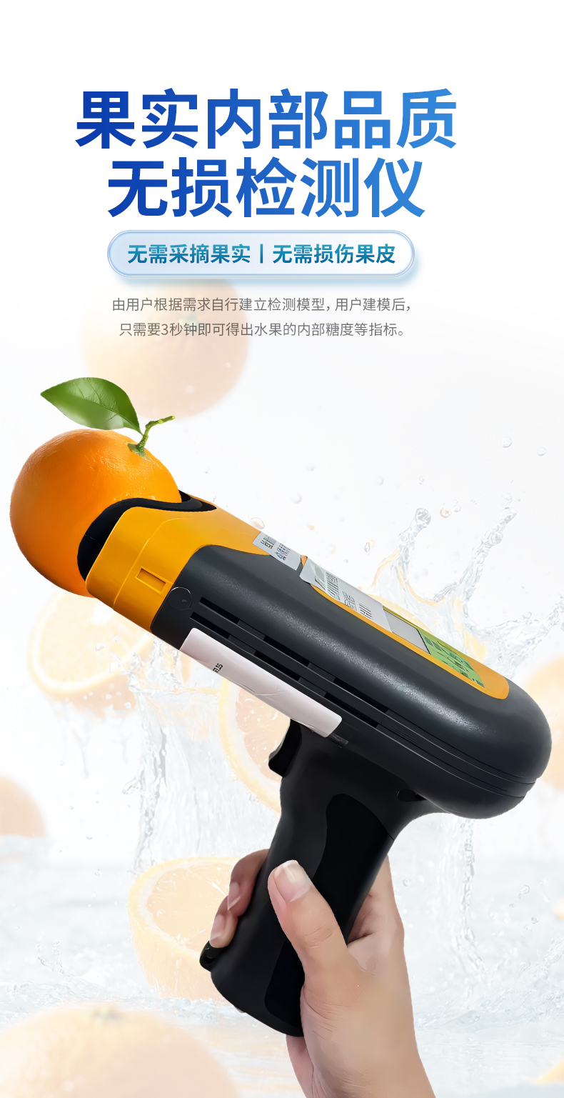 果實內部品質無損檢測儀,使用近紅外光譜分析原理, 對果實內部成分含 量進行預測。儀器由近紅外光譜儀、光源、處理器、顯示屏等組成。儀器光源發出近紅外光,使果實內部的分子振動并發生能級躍遷,進而產生近紅外光譜,因為近紅外光譜和果實品質方面的成分含量具有相關性(如糖度、干物質等),可通過數學算法建立相關品質信息的預測模型,因此,在預測未知的水果樣品時,只需要使用無損檢測儀去掃描它,獲取它的光譜信息,即可通過模型提供該水果樣品的品質預測結果。