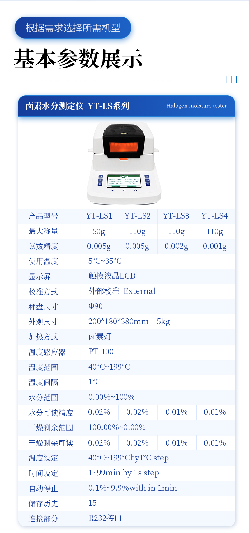| 產(chǎn)品型號(hào) Model:YT-LS1,**稱量 Range(g):50g,讀數(shù)精度 Readability(g): 0.005g,水分可讀精度 Moisturereadability:0.02%,干燥剩余可讀 Dryresidualreadability:0.02% | 產(chǎn)品型號(hào) Model:YT-LS2,**稱量 Range(g):110g,讀數(shù)精度 Readability(g): 0.005g,水分可讀精度 Moisturereadability:0.02%,干燥剩余可讀 Dryresidualreadability:0.02% | 產(chǎn)品型號(hào) Model:YT-LS3,**稱量 Range(g):110g,讀數(shù)精度 Readability(g): 0.002g,水分可讀精度 Moisturereadability:0.01%,干燥剩余可讀 Dryresidualreadability:0.01% | 產(chǎn)品型號(hào) Model:YT-LS4,**稱量 Range(g):110g,讀數(shù)精度 Readability(g): 0.001g, 水分可讀精度 Moisturereadability :0.01%,干燥剩余可讀 Dryresidualreadability: 0.01% | 使用溫度 OperatingTemp.Range:5°C---35°C | 顯示屏 Display :觸摸液晶LCD | 校準(zhǔn)方式 Calibration:外部校準(zhǔn) External | 秤盤尺寸 Pansize(mm): Φ90 | 外觀尺寸 Dimensions(W*L*H) :200*180*380 | 產(chǎn)品重量 Weight(Kg):5 | 加熱方式 Heatsoure:鹵素?zé)? Halogenlamp | 溫度感應(yīng)器 Temp.sensor: PT-100 | 溫度范圍 Temp.range:40°C---199°C | 溫度間隔 Temp.step:1°C | 水分范圍 Moisturerange :0.00%---100% | 干燥剩余范圍 Dryresidualrange:100.00%---0.00% | ATRO:100%---999% | ATRO:0%---999% | 溫度設(shè)定 Temperaturesetting:40°C---199°Cby1°Cstep | 時(shí)間設(shè)定 Timesetting:1---99min by 1s step | 自動(dòng)停止 Autostop :0.1%---9.9%within 1min | 儲(chǔ)存歷史 Nuberofstorage:15 | 加熱部分 Heater:220V+15% 50Hz115V+15% 400W | 連接部分:R232接口 | 天平部分 Balance: External power supply Output:9V Lnput:220V+15%50Hz |