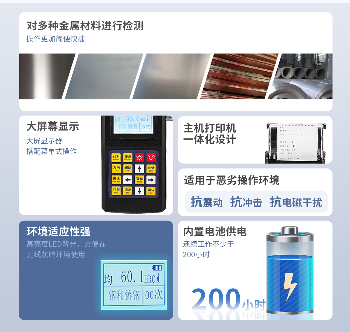該儀器是一款集可內(nèi)置打印機(jī)、公差設(shè)置等多功能為一體的硬度測量儀器,內(nèi)置高速熱敏打印機(jī),支持現(xiàn)場即時(shí)打印,測量結(jié)果的公正性及數(shù)據(jù)的存儲、可追溯性。使用全中文顯示,菜單式操作,操作簡單、方便。本機(jī)可直接顯示里氏、布氏、洛氏、維氏、肖氏等多種硬度值。儀器小巧、便攜、性價(jià)高,適用于惡劣的操作環(huán)境,抗振動(dòng)、沖擊和電磁干擾。