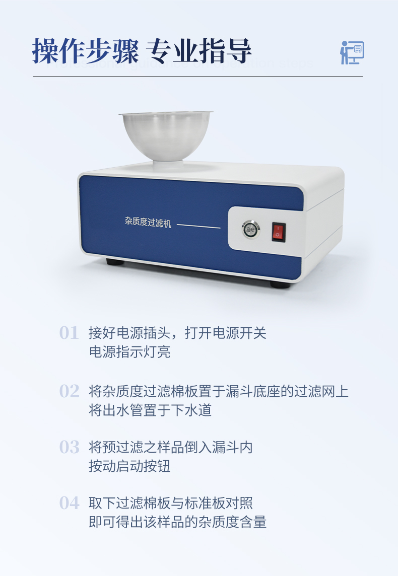 | 1. 接通電源,打開開關(指示燈亮)。 | 2. 將過濾棉板置于漏斗底座的過濾網上,出水管接入下水道。 | 3. 將樣品倒入漏斗,按下啟動按鈕進行過濾。 | 4. 過濾完成后取下棉板,與標準板對照,判斷雜質度含量。 |