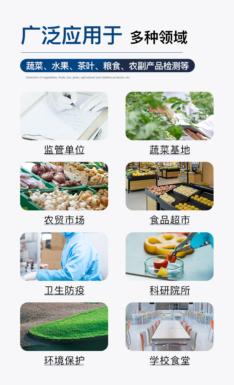 廣泛應用于主要用于蔬菜、水果、茶葉、糧食、農副產品等食品中有機磷和氨基甲酸酯類農藥殘留的快速檢測;此外還可用于果蔬茶生產基地和農貿批發銷售市場現場檢測,餐館、學校、食堂、家庭果蔬加工前的安全速測等,為廣大人民的生活安全提供保障。