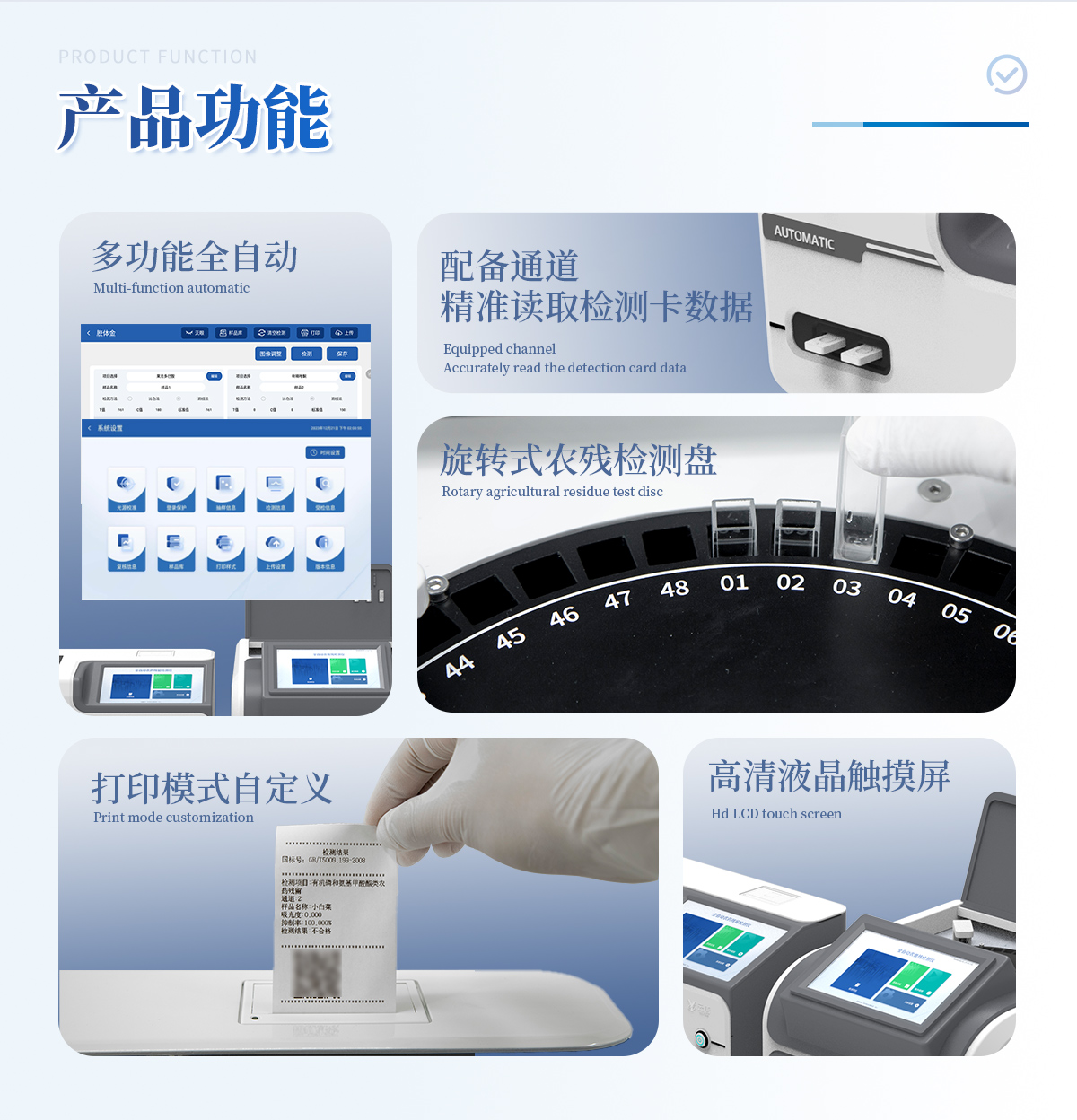 1. 試劑位置:3個2. 農殘檢測盤:旋轉24通道比色盤,可任意選擇檢測通道,自動對應選擇通道。3. 膠體金通道:2個,可讀取檢測卡結果,自動采集、處理分析,自動判斷檢測結果,并具備自動判空功能。4.系統配置:10.1寸高清液晶觸摸屏,采用ARM Cortex?-A7,RK3288/4核處理器,運行內存1GB。Android7.1.1 系統分辨率1280×800。5.恒溫系統:具有自動加溫溫控系統,精準恒溫37℃,精度±0.1℃。 6.添加系統:儀器按照試劑要求自動、按時、按量加入試劑,并且自動對未正常放置的樣本或異常的樣本進行檢查并提示。7.清洗功能:儀器具備回流及自動清洗管路功能,避免試劑污染。8.混勻功能:設備具備自動混勻功能。9.光源校準:設備可自動校準,確保檢測準確度。10.實時監控:儀器測試過程中屏幕顯示運行狀態,可實時查看。11.數據存儲:內部存儲16GB,可存儲500萬條數據。12.樣品多選功能:設備具備樣品一鍵多選功能,選擇樣品自動匹配檢測通道。13.項目預設:可提前設置單個及多個相同或不相同的檢測任務,可單次或者多次調取,減少檢測時間。14.自定義打印系統:內置自定義打印系統,可按需靈活設置開啟或關閉:產品合格證(國家農業部標準),二維碼,抽樣信息、檢測信息,受檢信息等信息的打印。15.A4版本報告打印功能:設備可自動生成A4版報告,A4報告帶二維碼,可掃描二維碼生成電子版,并可識別真偽。16.傳輸方式:儀器配備無線通信模塊: 4G(APN)通訊模塊、Wifi模塊,藍牙傳輸模塊,同時具有USB接口以及RJ45接口能以多種方式實現數據保存和數據傳輸功能,設備數據可以同步上傳至平臺。17.系統17.數據監管系統:設備自帶監管平臺,并可同步對接監管平臺,數據可局域網和互聯網數據上傳,檢測結果可直接傳至食品安全監管平臺。達到食品安全問題預估、預警。18.系統遠程更新功能:無需設備返廠,即可遠程實時升級全新系統,節省時間成本及避免運輸造成設備損。