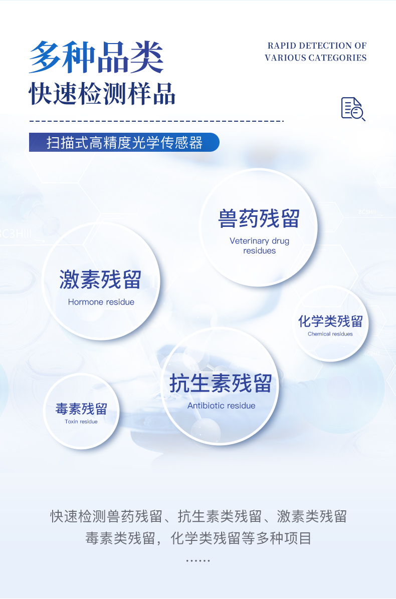 抗生素殘留檢測(cè)儀可現(xiàn)場(chǎng)快速檢測(cè)多類別抗生素類殘留,如可快速檢測(cè)四環(huán)素類、硝基呋喃類、磺胺類、沙星類、喹諾酮類、氯霉素、慶大霉素、鏈霉素、喹乙醇代謝物、硫酸鏈霉素、羧芐青霉素、噻孢菌素鈉、阿莫西林、氨芐西林、紅霉素、潮霉素B、安普霉紊、桿菌肽、氨丙琳、芐青霉家、頭孢噻呋、克拉維酸、氯羥吡啶、阿散酸等抗生素快速檢測(cè);水產(chǎn)獸藥:呋喃妥因代謝、呋喃西林代謝、呋喃它酮代謝、呋喃唑酮代謝、孔雀石綠等。