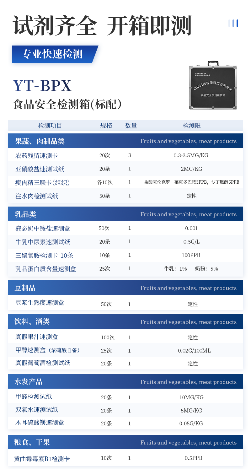 序號適用范圍檢測項目規格單位數量檢測限檢測范圍1果蔬、肉制品類便攜式農藥殘留快速檢測儀12通道臺1//農藥殘留速測卡20次盒30.3-3.5mg/kg/亞硝酸鹽速測試紙20條套12mg/kg0-40mg/kg砷速測盒30次盒1砷:2mg/kg    /汞速測盒30次盒1 汞:20mg/kg/瘦肉精三聯卡(組織)各10次包2鹽酸克倫克羅、萊克多巴胺3ppb,沙丁胺醇5ppb/2豆制品  奶制品液態奶新鮮度速測盒20次盒10.60T/豆漿生熟度速測盒 50次盒1定性/3飲料、酒類甲醇速測盒(濃硫酸自備) 25次盒10.02g/100mL0-0.32g/100mL4糧食、干果黃曲霉毒素B1檢測卡10次包10.5ppb/5食用油類食用油酸價速測盒100次盒11mg/kg0-8mg/kg食用油過氧化值速測盒100次盒10.09g/100g0.09-0.45g/100g6食物及水中毒物殘留毒鼠強速測盒(乙酸乙酯自備)10次盒12mg/kg/敵鼠鈉鹽速測盒100次盒1100mg/kg/氰化物檢測試紙20條套11mg/L0-10mg/L氟乙酰胺速測盒30次盒150mg/kg/硼酸和硼砂速測盒100次盒125mg/kg定性鼠藥安妥檢測試紙 40次包10.02mg/g,mL/鼠藥磷化鋅速測盒10次包120mg/kg/7箱體預裝輔助設備急性中毒箱箱體便攜式個1//便攜水浴鍋功率300W個1多功能剪刀-把1計算器-個1洗瓶250ml個1塑料滴管3ml根10塑料滴管0.2ml根50樣品管架10ml個1天平0.1-200g個1移液器1mL支1玻璃三角瓶100ml個2玻璃樣品管10ml個2小離心管1.5ml個24塑料樣品管10ml個10樣品瓶50ml個2離心管架1.5ml個1燒杯250ml個1量筒100ml個1手套-包1計時器-個1槍頭1ml個20組織提取器便攜式個1錫箔紙10張/包包1裝箱清單-份1產品合格證-份1使用說明書-份1