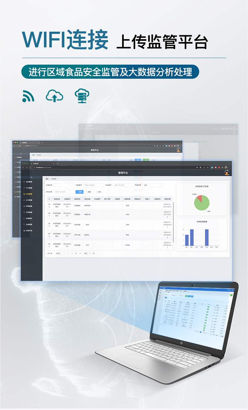 | 1、儀器采用臺(tái)式一體化系統(tǒng)檢測技術(shù),將分光光度模塊、膠體金檢測模塊、新型農(nóng)殘檢測模塊、數(shù)字化管理模塊、無線通訊模塊高度集成于一體,支持檢測200種食品安全檢測項(xiàng)目,同時(shí)預(yù)留升級(jí)檢測方法。 | 2、儀器檢測模塊標(biāo)準(zhǔn)化、智能化,檢測項(xiàng)目可隨意自由組合。檢測箱體內(nèi)置多個(gè)標(biāo)準(zhǔn)檢測單元,檢測模塊可以調(diào)整配置。 | 3、顯示屏幕:儀器采用10.1英寸豎向液晶觸摸屏顯,搭配運(yùn)行安卓智能操作系統(tǒng),主控芯片采用ARM Cortex-A7,RK3288/4核處理器,主頻1.88Ghz,操作方便,性能更強(qiáng)。 | 4、檢測通道:≥12通道;采用精密旋轉(zhuǎn)比色池設(shè)計(jì),使用同芯片同光源校準(zhǔn)精度,解決不同光源之間的誤差值,更加準(zhǔn)確**。(1-12通道間誤差0.1%,***:**202022821055.2) | 5、儀器光源:高精度進(jìn)口四波長冷光源,每個(gè)通道均配置 410、520、590、630nm 波長光源,標(biāo)配**的光路切換裝置,專利光路切換功能可實(shí)現(xiàn)64波長,并且所有檢測項(xiàng)目可實(shí)現(xiàn)所有通道同時(shí)檢測。 | 6、設(shè)備可一鍵校準(zhǔn),自動(dòng)保存校準(zhǔn)數(shù)據(jù),自動(dòng)對(duì)比校驗(yàn),得到精準(zhǔn)光源,采用Android SP存儲(chǔ)數(shù)據(jù),光源數(shù)據(jù)永不丟失,方便每一次使用。 | 7、通訊接口:配備無線通信模塊、4G(APN)通訊模塊、藍(lán)牙傳輸,同時(shí)具有雙USB接口以及RJ45網(wǎng)線接口,可以多方式實(shí)現(xiàn)數(shù)據(jù)保存及數(shù)據(jù)傳輸。 | 8、存儲(chǔ)方式:支持U盤存儲(chǔ),標(biāo)準(zhǔn)USB接口,免驅(qū)動(dòng)安裝。檢測結(jié)果存儲(chǔ)容量20萬條以上,可生成Excel表格進(jìn)行拷貝,并具有登錄保護(hù)功能。 | 9、智能化操作系統(tǒng): | 9.1、操作系統(tǒng):儀器可在同一檢測界面自動(dòng)對(duì)應(yīng)相關(guān)檢測通道,一次性選擇1-12個(gè)樣品名稱,無需退出界面,節(jié)省操作時(shí)間。并可以對(duì)每個(gè)通道屬性和樣品信息單獨(dú)進(jìn)行編輯,例如送檢單位、人員,檢測人員等,打印時(shí)勾選打印顯示。 | 9.2、數(shù)據(jù)集成系統(tǒng):設(shè)備首頁自動(dòng)匯總分析檢測數(shù)據(jù),包含:周檢測數(shù)據(jù)、月檢測數(shù)據(jù),全部檢測總數(shù)量,均包含檢測總數(shù),合格數(shù),不合格數(shù),以及相關(guān)柱形分析圖,各項(xiàng)檢測數(shù)據(jù)一目了然,無需電腦查詢,更加快捷直觀。 | 9.3、數(shù)據(jù)庫系統(tǒng):十幾項(xiàng)數(shù)據(jù)庫分類管理儀器:包含項(xiàng)目類型、項(xiàng)目數(shù)據(jù)、檢測數(shù)據(jù)、歷史記錄、國標(biāo)信息、曲線信息、采樣信息、檢測信息、受檢信息、復(fù)核信息、圖表信息、光源校準(zhǔn)信息、打印樣式信息、樣品庫信息等等,數(shù)據(jù)庫之間互相協(xié)調(diào)聯(lián)動(dòng)保證數(shù)據(jù)的真實(shí)完整性。同時(shí)產(chǎn)品數(shù)據(jù)庫以及歷史檢測記錄支持一鍵檢索功能。 | 9.4、限量規(guī)判系統(tǒng):具有限量查詢、添加物質(zhì)合規(guī)判定系統(tǒng)。檢測出結(jié)果后,系統(tǒng)自動(dòng)調(diào)用系統(tǒng)數(shù)據(jù)庫中相關(guān)國標(biāo)進(jìn)行比對(duì)判定,客觀顯示判定結(jié)果是否合格。 | 9.5、項(xiàng)目預(yù)設(shè)系統(tǒng):儀器具有任務(wù)預(yù)設(shè)模塊,一鍵提前預(yù)設(shè),給出方便快捷的新檢測方案,每一個(gè)任務(wù)分別可以設(shè)置不同的樣品、批次、編號(hào)、來源、備注、抽樣信息、檢測信息、受檢信息、復(fù)核信息等更多信息。樣品送檢時(shí)一鍵調(diào)取保存信息,并可多次調(diào)取,大大提高檢測效率。 | 9.6、數(shù)據(jù)監(jiān)管系統(tǒng):同步對(duì)接監(jiān)管平臺(tái),數(shù)據(jù)可局域網(wǎng)和互聯(lián)網(wǎng)數(shù)據(jù)上傳,檢測結(jié)果可選擇直接傳至食品安全監(jiān)管平臺(tái)。進(jìn)行區(qū)域食品安全監(jiān)管及大數(shù)據(jù)分析處理與數(shù)據(jù)統(tǒng)計(jì),檢測區(qū)域食品安全長短期動(dòng)態(tài),達(dá)到食品安全問題預(yù)估、預(yù)警。 | 9.7.1、全新打印系統(tǒng):內(nèi)置全新打印機(jī),新創(chuàng)自定義打印方式,可按需靈活勾選控制:產(chǎn)品合格證(國家農(nóng)業(yè)部標(biāo)準(zhǔn)要求),二維碼,抽樣信息、檢測信息,受檢信息、復(fù)核信息、抽樣日期、檢測日期等信息的打印。 | 9.7.2、A4紙版本報(bào)告打印功能(選配):設(shè)備擁有兩種結(jié)果展示方式,可以自動(dòng)生成A4打印模板和小票打印模板兩種樣式,可通過WiFi及網(wǎng)線等方式鏈接外置打印機(jī)可進(jìn)行打印。 | 10、供電模式:儀器交直流兩用,直流12V供電,可連接車載電源,可配6ah大容量充電鋰電池,電量可實(shí)時(shí)顯示,方便戶外流動(dòng)測試。 | 11、膠體金檢測模塊:采用單通道CMOS成像處理技術(shù)及膠體金免疫層析技術(shù),可讀取膠體金卡數(shù)據(jù),自動(dòng)采集、處理分析,將檢測結(jié)果顯示,并可根據(jù)參考限值自動(dòng)判斷檢測結(jié)果,可檢測常見的獸藥殘留、生物毒素、抗生素、違禁添加物等。 | 11.1、探測技術(shù):CMOS成像探測; | 11.2、檢測通道:1個(gè)通道; | 11.3、檢測方式:消線法和比色法; | 11.4、顯
