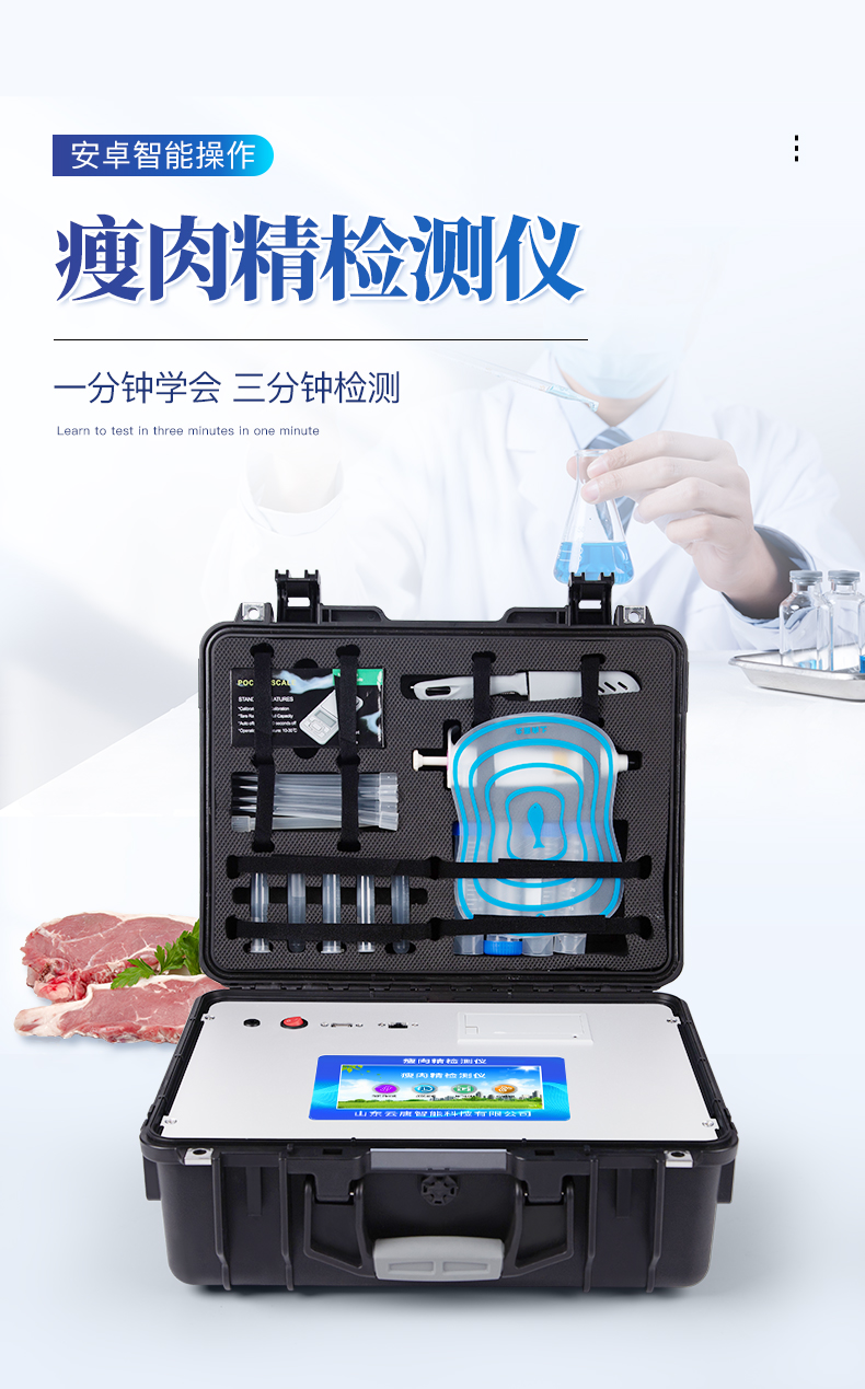 瘦肉精檢測儀可現場快速檢測鹽酸克倫特羅、萊克多巴胺、沙丁胺醇、己烯雌酚、喹乙醇等。儀器預留其他項目檢測程序和端口,根據日后需求可方便的自主增加檢測項目。日后可升級為檢測抗生素、獸藥殘留、動物疫病、病害肉、的綜合類型儀器。