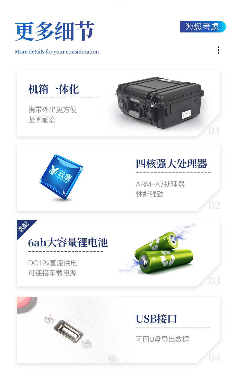 3、交直流兩用,直流12V供電,可連接車載電源,可配6ah大容量充電鋰電池,方便戶外流動測試。