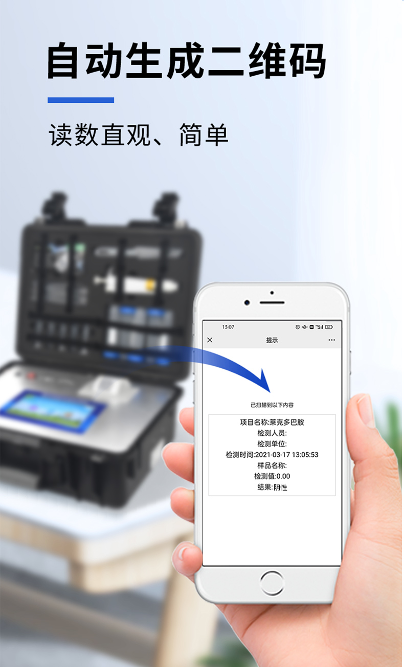 瘦肉精檢測儀可現(xiàn)場快速檢測鹽酸克倫特羅、萊克多巴胺、沙丁胺醇、己烯雌酚、喹乙醇等。儀器預(yù)留其他項(xiàng)目檢測程序和端口,根據(jù)日后需求可方便的自主增加檢測項(xiàng)目。日后可升級為檢測抗生素、獸藥殘留、動(dòng)物疫病、病害肉、的綜合類型儀器