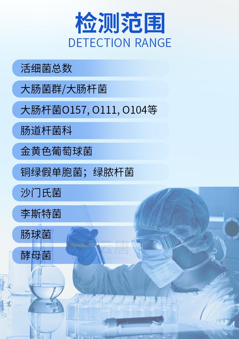 | 1. 食品:肉類、果蔬、奶制品、主食、調味料、飲料、半處理類食品以及飲料等,農產品及相關加工公司; | 2.水質:生活飲用水、自然界水源、制水廠; | 3. 表面:潔凈臺、餐具/ 器具表面; | 4. 其他:藥品、化妝品等; | 5. HACCP( 危害分析和關鍵控制點) 診斷,以及適用于災難現場、臨場、抽檢、大型會議等微生物安全快速檢測。 |