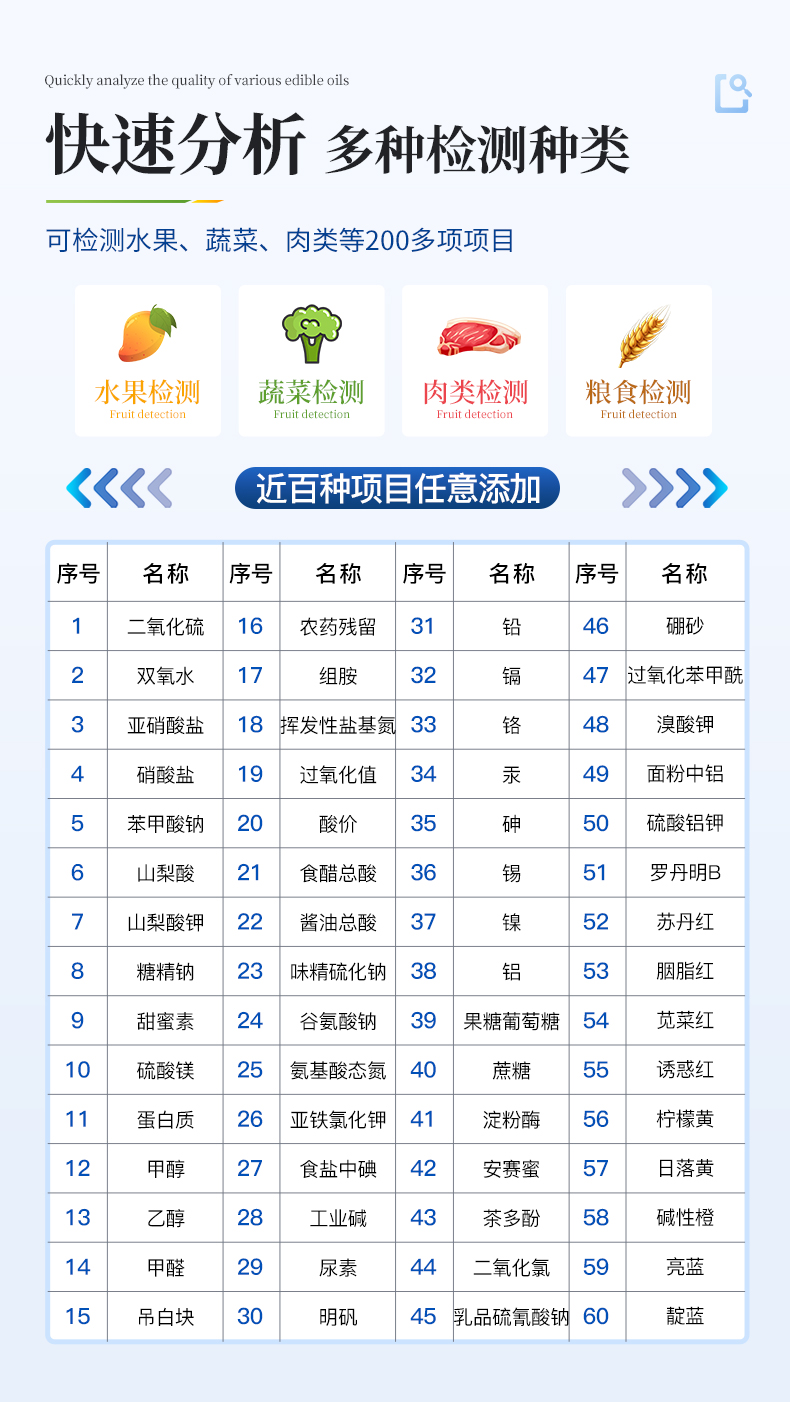高精度食品安全檢測儀可快速檢測60多項(xiàng)目,包含:濫用食品添加劑、非食用化學(xué)物質(zhì)、農(nóng)藥殘留、重金屬含量、病害肉成分、營養(yǎng)強(qiáng)化劑、化學(xué)類殘留、食用油脂檢測、水酒飲品分析、調(diào)味品成分、食用色素等現(xiàn)場的定性定量檢測。