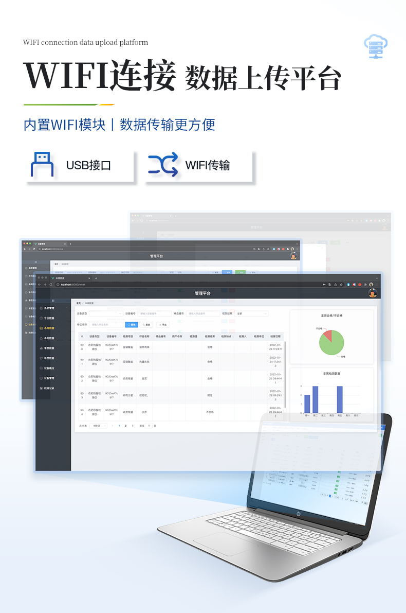 8.3、數(shù)據(jù)監(jiān)管系統(tǒng):同步對接監(jiān)管平臺,數(shù)據(jù)可局域網(wǎng)和互聯(lián)網(wǎng)數(shù)據(jù)上傳,檢測結(jié)果可選擇直接傳至食品安全監(jiān)管平臺。進(jìn)行區(qū)域食品安全監(jiān)管及大數(shù)據(jù)分析處理與數(shù)據(jù)統(tǒng)計(jì),檢測區(qū)域食品安全長短期動態(tài),達(dá)到食品安全問題預(yù)估、預(yù)警。