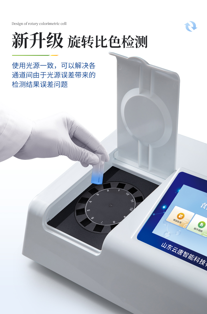 4、檢測通道:12通道;采用精密旋轉(zhuǎn)比色池設(shè)計(jì),使用同芯片同光源校準(zhǔn)精度,解決不同光源之間的誤差值,更加準(zhǔn)確**。