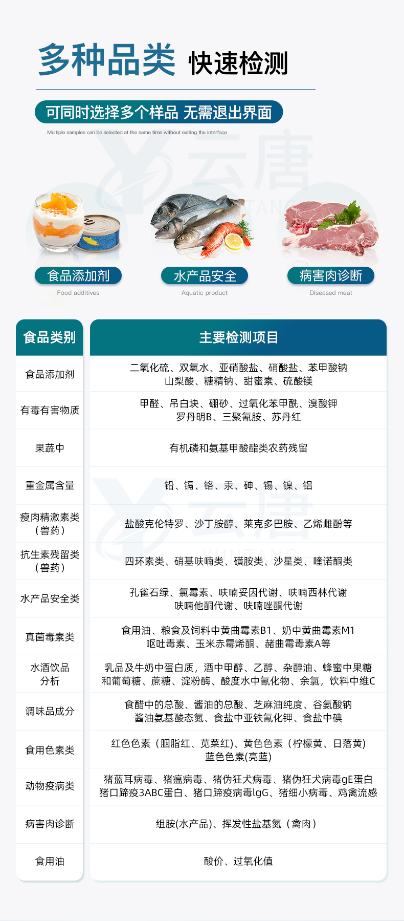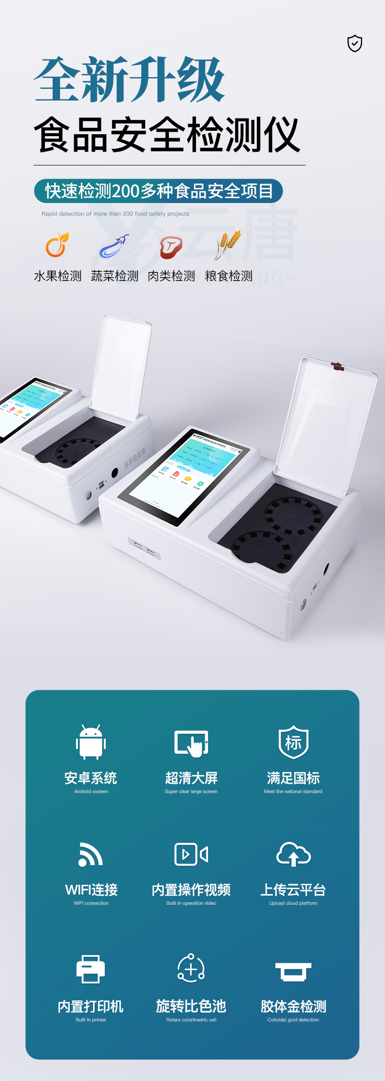 山東云唐智能科技有限公司生產(chǎn)的高智能食品安全檢測(cè)儀為集成化食品安全快速檢測(cè)分析設(shè)備,采用臺(tái)式一體化設(shè)計(jì),可快速檢測(cè)200多種食品安全項(xiàng)目,包含非食用化學(xué)物質(zhì)、濫用食品添加劑、農(nóng)藥殘留、獸藥殘留、重金屬、病害肉、營養(yǎng)強(qiáng)化劑、抗生素類殘留、激素類殘留、真菌毒素類殘留、化學(xué)類殘留等項(xiàng)目的定性定量檢測(cè)。目前廣泛應(yīng)用于市場(chǎng)監(jiān)管局、檢測(cè)中心、衛(wèi)生監(jiān)督部門、農(nóng)業(yè)部門、院校及各單位食堂、食品肉產(chǎn)品深加工企業(yè)、商超市場(chǎng)、司法部門、餐飲機(jī)構(gòu)、養(yǎng)殖場(chǎng)、屠宰場(chǎng)、檢驗(yàn)檢疫部門等單位。
