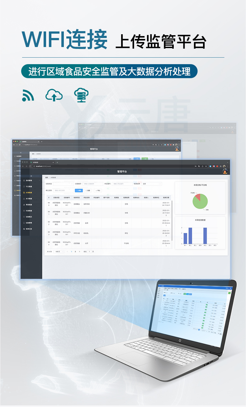 山東云唐智能科技有限公司生產的高智能食品安全檢測儀為集成化食品安全快速檢測分析設備,采用臺式一體化設計,可快速檢測200多種食品安全項目,包含非食用化學物質、濫用食品添加劑、農藥殘留、獸藥殘留、重金屬、病害肉、營養強化劑、抗生素類殘留、激素類殘留、真菌毒素類殘留、化學類殘留等項目的定性定量檢測。目前廣泛應用于市場監管局、檢測中心、衛生監督部門、農業部門、院校及各單位食堂、食品肉產品深加工企業、商超市場、司法部門、餐飲機構、養殖場、屠宰場、檢驗檢疫部門等單位。