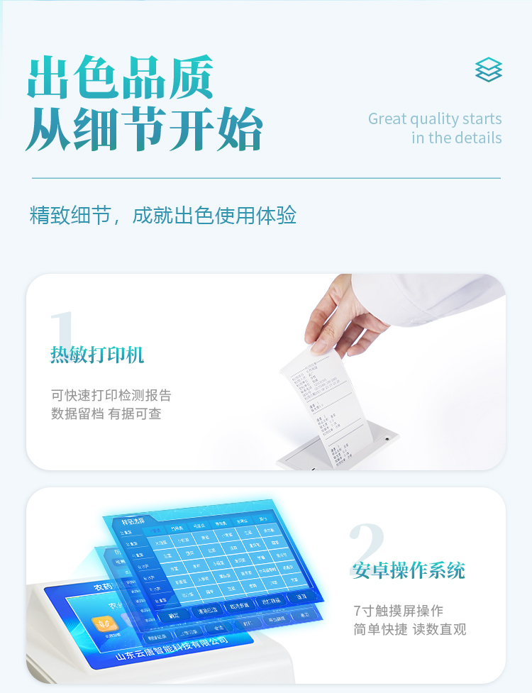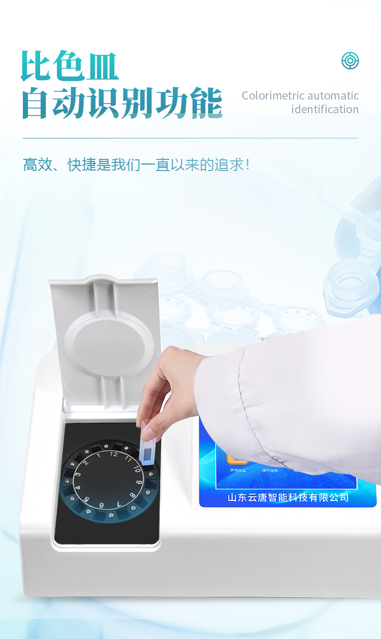 | 機器采用全新安卓智能系統,主控芯片采用 ARM Cortex-A7,RK3288/4核處理器,主頻1.88Ghz,運轉速度更快速,穩定性更強。 | 創新檢測模式: *儀器采用精密旋轉比色池設計,使用光源一致,可以解決各通道間由于光源誤差帶來的檢測結果誤差問題,檢測結果更加精準。 *儀器具有自動識別比色皿檢測功能,即:將樣品比色皿放入儀器后,點擊樣品檢測,儀器自動識別比色皿進行通道檢測。 | 供電方式:交直流兩用,直流 12V 供電,可連接車載電源,可配 6ah 大容量充電鋰電池,方便戶外流動測試。 | 顯示方式:7英寸液晶觸摸屏顯示,人性化中文操作界面,讀數直觀、簡單。 | 檢測通道:8個檢測通道,可以同時測試多個樣品,循環檢測,即放即檢,每個樣品由程序控制分別獨立工作,不會互相干擾。 | 高精光源系統: ①①儀器光源采用進口超高亮發光二極管,光源亮度可以自動調節與校準 ②智能恒流穩壓,光強自動校準,長時間連續工作光源無溫漂現象。 | 智能操作分析系統: ①儀器具有100多種蔬菜名稱菜單庫,分類管理,并可按需添加或刪除、編輯蔬菜名稱;可在同一檢測界面自動對應相關檢測通道一次性選擇1-24個樣品名稱,無需退出界面,節省操作時間。 ②內置新國家限量標準,與所測結果進行現場比對,并持續更新標準。 | 完善的配套硬件: ①采用串口5v打印機,可選擇手動打印或者自動打印,三分鐘出打印結果,打印格式為檢測人姓名、吸光度差值、檢測時間、檢測機構、樣品名稱及結果判定。 ②儀器具有無線上傳模塊,檢測結果可批量打印,批量上傳。 | 數據調用: ①儀器可存儲20萬條檢測結果, ②檢測結果為Excel表格,方便后期進行數據分析與匯總報告 ③儀器采用USB2.0接口設計,支持 U 盤存儲,方便數據的存貯和移動,并可隨時與計算機直接相連,實現數據查詢、瀏覽、分析、統計、打印等。 | 后期產品固件可升級。 | 安全證書,放心保障:儀器具有中國計量科學研究院校準證書,權威認證,使用放心。 |