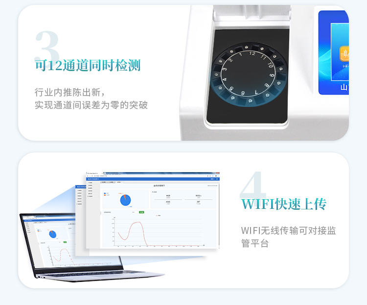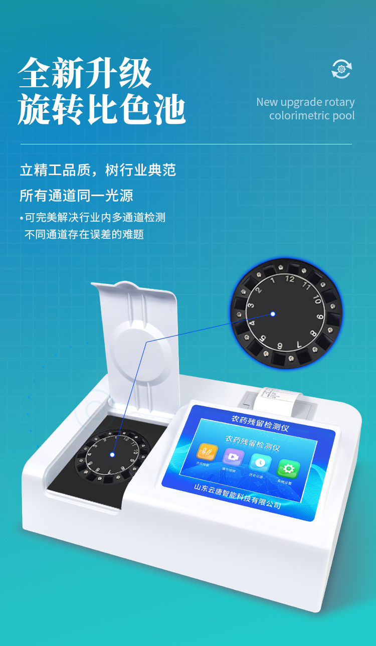 | 機器采用全新安卓智能系統,主控芯片采用 ARM Cortex-A7,RK3288/4核處理器,主頻1.88Ghz,運轉速度更快速,穩定性更強。 | 創新檢測模式: *儀器采用精密旋轉比色池設計,使用光源一致,可以解決各通道間由于光源誤差帶來的檢測結果誤差問題,檢測結果更加精準。 *儀器具有自動識別比色皿檢測功能,即:將樣品比色皿放入儀器后,點擊樣品檢測,儀器自動識別比色皿進行通道檢測。 | 供電方式:交直流兩用,直流 12V 供電,可連接車載電源,可配 6ah 大容量充電鋰電池,方便戶外流動測試。 | 顯示方式:7英寸液晶觸摸屏顯示,人性化中文操作界面,讀數直觀、簡單。 | 檢測通道:12個檢測通道,可以同時測試多個樣品,循環檢測,即放即檢,每個樣品由程序控制分別獨立工作,不會互相干擾。 | 高精光源系統: ①①儀器光源采用進口超高亮發光二極管,光源亮度可以自動調節與校準 ②智能恒流穩壓,光強自動校準,長時間連續工作光源無溫漂現象。 | 智能操作分析系統: ①儀器具有100多種蔬菜名稱菜單庫,分類管理,并可按需添加或刪除、編輯蔬菜名稱;可在同一檢測界面自動對應相關檢測通道一次性選擇1-24個樣品名稱,無需退出界面,節省操作時間。 ②內置新國家限量標準,與所測結果進行現場比對,并持續更新標準。 | 完善的配套硬件: ①采用串口5v打印機,可選擇手動打印或者自動打印,三分鐘出打印結果,打印格式為檢測人姓名、吸光度差值、檢測時間、檢測機構、樣品名稱及結果判定。 ②儀器具有無線上傳模塊,檢測結果可批量打印,批量上傳。 | 數據調用: ①儀器可存儲20萬條檢測結果, ②檢測結果為Excel表格,方便后期進行數據分析與匯總報告 ③儀器采用USB2.0接口設計,支持 U 盤存儲,方便數據的存貯和移動,并可隨時與計算機直接相連,實現數據查詢、瀏覽、分析、統計、打印等。 | 后期產品固件可升級。 | 安全證書,放心保障:儀器具有中國計量科學研究院校準證書,權威認證,使用放心。 |