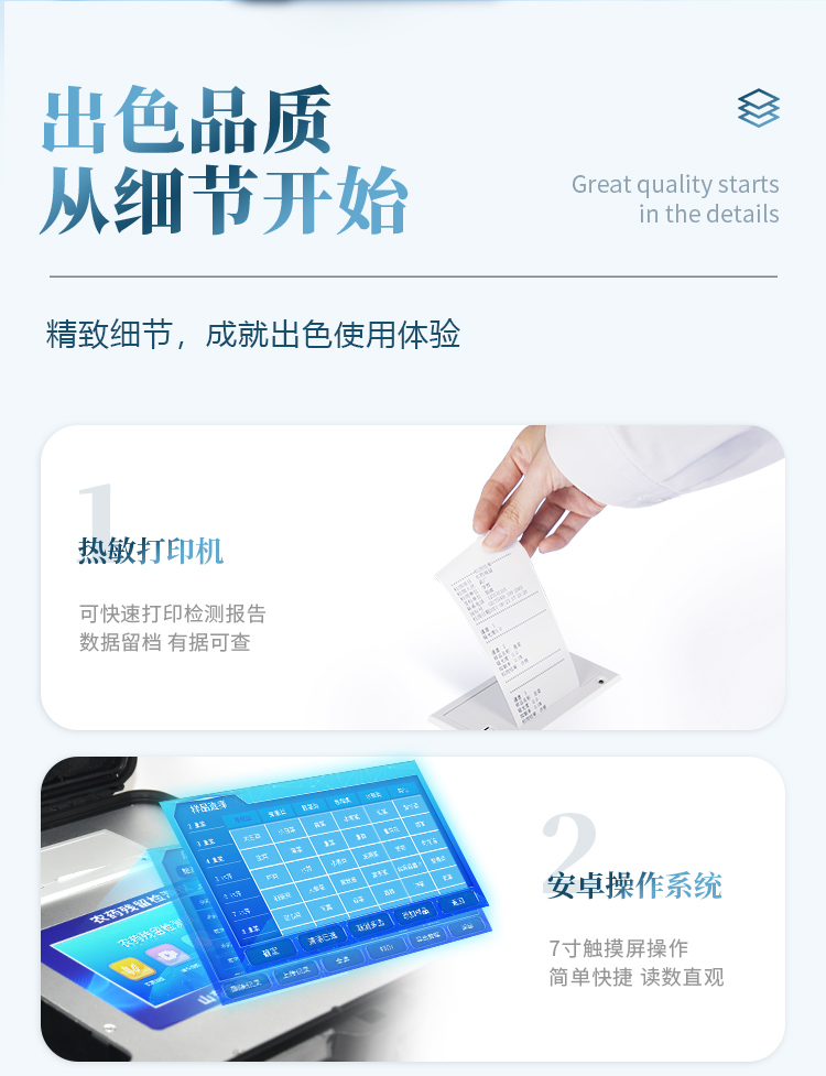 安卓智能操作系統,采用更加**和人性化操作,儀器具有無線聯網上傳功能,快速上傳數據,進行數據統計和分析。智能化程度高,儀器具有自檢功能:具有開機自檢和調零功能,具有自動檢測重復性功能;同時,檢測完成可自動打印檢測報告和二維碼。手機掃碼可顯示出詳細檢測信息。儀器帶有監管平臺,數據可局域網和互聯網數據上傳,檢測結果直接傳至食品安全監管平臺。進行區域食品安全監管及大數據分析處理與數據統計,檢測區域食品安全長短期動態,達到食品安全問題預估、預警 。樣品處理簡單省力,整體操作快速、安全、便捷。儀器具有自身保護功能,可設置用戶名及密碼,防止非工作人員操作等。內置強大的數據庫,可在儀器上直接選擇樣品名稱、檢測指標、送檢單位等信息,也可在儀器上直接編輯錄入樣品名稱、檢測指標、送檢單位等信息并保存進樣品數據庫,方便后期操作調取使用。儀器具有重新校準、鎖定、恢復出廠設置功能。