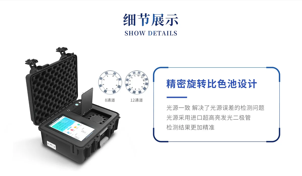 | 儀器采用手提式一體化系統檢測技術,將分光光度模塊、膠體金檢測模塊、新型農殘檢測模塊、數字化管理模塊、無線通訊模塊高度集成于一體,支持檢測200種食品安全檢測項目,同時預留升級檢測方法。 | 儀器檢測模塊標準化、智能化,檢測項目可隨意自由組合。檢測箱體內置多個標準檢測單元,檢測模塊可以調整配置。 | 顯示屏幕:儀器采用10.1英寸豎向液晶觸摸屏顯,搭配運行安卓智能操作系統,主控芯片采用ARM Cortex-A7,RK3288/4核處理器,主頻1.88Ghz,操作方便,性能更強。 | 檢測通道:≥12通道;采用精密旋轉比色池設計,使用同芯片同光源校準精度,解決不同光源之間的誤差值,更加準確**。(1-12通道間誤差0.1%,***:**202022821055.2) | 儀器光源:高精度進口四波長冷光源,每個通道均配置 410、520、590、630nm 波長光源,標配**的光路切換裝置,專利光路切換功能可實現64波長,并且所有檢測項目可實現所有通道同時檢測。 | 設備可一鍵校準,自動保存校準數據,自動對比校驗,得到精準光源,采用Android SP存儲數據,光源數據永不丟失,方便每一次使用。 | 通訊接口:配備無線通信模塊、4G(APN)通訊模塊、藍牙傳輸,同時具有雙USB接口以及RJ45網線接口,可以多方式實現數據保存及數據傳輸。 | 存儲方式:支持U盤存儲,標準USB接口,免驅動安裝。檢測結果存儲容量20萬條以上,可生成Excel表格進行拷貝,并具有登錄保護功能。 | 智能化操作系統:: ★操作系統:儀器可在同一檢測界面自動對應相關檢測通道,一次性選擇1-12個樣品名稱,無需退出界面,節省操作時間。并可以對每個通道屬性和樣品信息單獨進行編輯,例如送檢單位、人員,檢測人員等,打印時勾選打印顯示。 | ★數據集成系統:設備首頁自動匯總分析檢測數據,包含:周檢測數據、月檢測數據,全部檢測總數量,均包含檢測總數,合格數,不合格數,以及相關柱形分析圖,各項檢測數據一目了然,無需電腦查詢,更加快捷直觀。 | ★數據庫系統:十幾項數據庫分類管理儀器:包含項目類型、項目數據、檢測數據、歷史記錄、國標信息、曲線信息、采樣信息、檢測信息、受檢信息、復核信息、圖表信息、光源校準信息、打印樣式信息、樣品庫信息等等,數據庫之間互相協調聯動保證數據的真實完整性。同時產品數據庫以及歷史檢測記錄支持一鍵檢索功能。 | ★限量規判系統:具有限量查詢、添加物質合規判定系統。檢測出結果后,系統自動調用系統數據庫中相關國標進行比對判定,客觀顯示判定結果是否合格 | ★項目預設系統:儀器具有任務預設模塊,一鍵提前預設,給出方便快捷的新檢測方案,每一個任務分別可以設置不同的樣品、批次、編號、來源、備注、抽樣信息、檢測信息、受檢信息、復核信息等更多信息。樣品送檢時一鍵調取保存信息,并可多次調取,大大提高檢測效率。 | ★數據監管系統:同步對接監管平臺,數據可局域網和互聯網數據上傳,檢測結果可選擇直接傳至食品安全監管平臺。進行區域食品安全監管及大數據分析處理與數據統計,檢測區域食品安全長短期動態,達到食品安全問題預估、預警。 | ★打印系統:內置全新打印機,新創自定義打印方式,可按需靈活勾選控制:產品合格證(國家農業部標準要求),二維碼,抽樣信息、檢測信息,受檢信息、復核信息、抽樣日期、檢測日期等信息的打印。 | 供電模式:儀器交直流兩用,直流12V供電,可連接車載電源,可配6ah大容量充電鋰電池,電量可實時顯示,方便戶外流動測試。 | 膠體金檢測模塊:采用雙通道CMOS成像處理技術及膠體金免疫層析技術,可同時讀取雙膠體金卡數據,自動采集、處理分析,將檢測結果顯示,并可根據參考限值自動判斷檢測結果,可檢測常見的獸藥殘留、生物毒素、抗生素、違禁添加物等。 | ★探測技術:CMOS成像探測; | ★檢測通道:1個通道; | ★檢測方式:消線法和比色法; | ★顯示模式:陰性或陽性; | ★曲線形式:軌道式掃描方式,顯示金標卡圖像,實時生成、識別CT曲線圖,無需手動調整,完成檢測后自動退出檢測卡。兼容市場上其他金標卡,使用耗材不受限制。 | 儀器加入遠程升級功能,可定向分客戶分儀器更新,開機后自動更新,客戶無需任何操作,即可升級全新項目。做到了無需退換機器即可實現實時遠程升級檢測儀器。 |