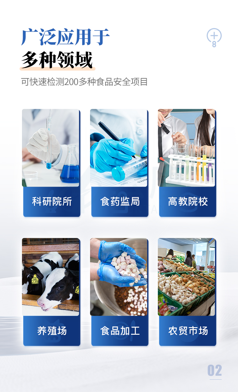 | 食品添加劑:二氧化硫、雙氧水、亞硝酸鹽、硝酸鹽、苯甲酸鈉、山梨酸鉀、糖精鈉、甜蜜素、木耳硫酸鎂等 | 有毒有害物質:甲醛、吊白塊、硼砂、過氧化苯甲酰、溴酸鉀、羅丹明B、三聚氰胺、蘇丹紅、工業堿、尿素、明礬等 | 果蔬:農藥殘留(酶抑制率法) | 病害肉診斷:組胺、揮發性鹽基氮; | 重金屬含量:鉛、鎘、鉻、汞、砷、錫、鎳、鋁等; | 食用油脂: 過氧化值、酸價等 | 瘦肉精激素類(獸藥):鹽酸克倫特羅、沙丁胺醇、萊克多巴胺、己烯雌酚等 | 抗生素殘留類(獸藥):四環素類、硝基呋喃類、磺胺類、β-興奮劑類、沙星類、磺胺類、喹諾酮類,甲砜霉素,氟苯尼考,金剛烷胺、替米考星、慶大霉素、林可霉素、鏈霉素、恩諾沙星、環丙沙星、頭孢啦啶、青霉素、阿莫西林等 | 真菌毒素類:食用油、糧食及飼料中黃曲霉毒素B1、黃曲霉毒素總量,奶中黃曲霉毒素M1、嘔吐毒素、玉米赤霉烯酮、赭曲霉毒素A、T2毒素、伏馬毒素等; | 水酒飲品分析:酒中甲醇、乙醇、乳品及牛奶中蛋白質, | 調味品成分:食醋的總酸、醬油的總酸、芝麻油純度、谷氨酸鈉、醬油氨基酸態氮、食鹽中亞鐵氰化鉀、食鹽中碘等 | 食用色素類:紅色色素(胭脂紅、莧菜紅、赤蘚紅、誘惑紅)、黃色色素(檸檬黃、日落黃)、藍色色素(亮藍)等 | 動物疫病類:禽流感、新城疫、牛羊口蹄疫、牛羊結核病、牛羊包蟲、牛羊布病、小反芻獸、豬藍耳病毒、豬瘟病毒、豬偽狂犬病毒、豬細小、豬圓環、犬細小病毒、犬瘟熱病毒、犬狂犬病毒等; | 蜂蜜成分:果糖和葡萄糖、蔗糖、淀粉酶、酸度等 | 水產品安全類:孔雀石綠、氯霉素、呋喃妥因、呋喃西林、呋喃它酮、呋喃唑酮等 | 蛋類藥物殘留:氯霉素,四環素,磺胺類,喹諾酮類,呋喃西林,呋喃它酮,呋喃妥因,呋喃唑酮,氟苯尼考,阿莫西林、頭孢氨芐、紅霉素、鏈霉素等 |