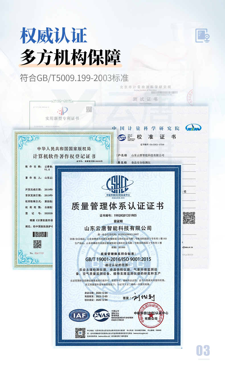 山東云唐智能科技有限公司生產的高智能食品安全檢測儀為集成化食品安全快速檢測分析設備,采用臺式一體化設計,可快速檢測200多種食品安全項目,包含非食用化學物質、濫用食品添加劑、農藥殘留、獸藥殘留、重金屬、病害肉、營養強化劑、抗生素類殘留、激素類殘留、真菌毒素類殘留、化學類殘留等項目的定性定量檢測。該高智能食品安全檢測儀為集成化食品安全快速檢測分析設備,目前已于食藥監局、衛生部門、高教院校、科研院所、農業部門、養殖場、屠宰場、食品肉產品深加工企業及檢驗檢疫部門等單位廣泛使用。