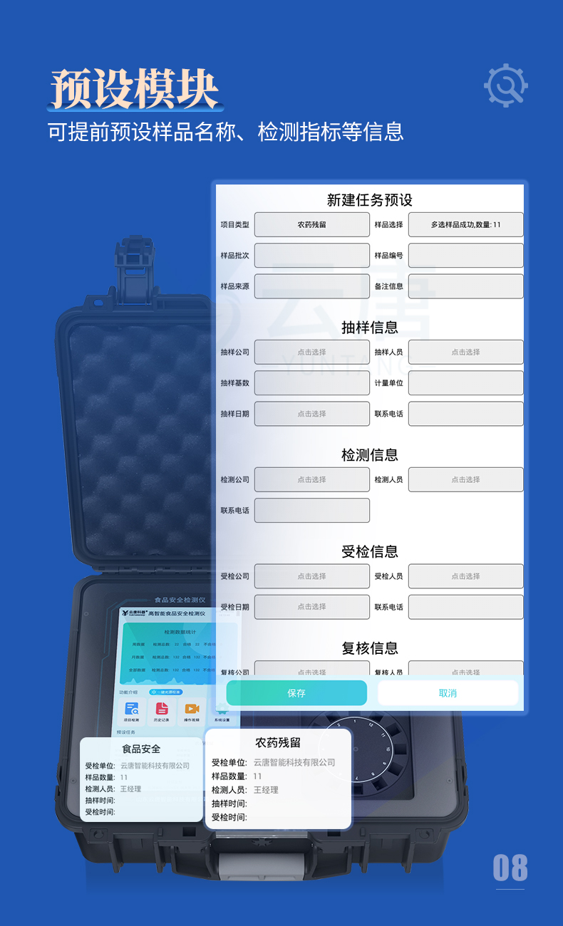 山東云唐智能科技有限公司生產(chǎn)的高智能食品安全檢測(cè)儀為集成化食品安全快速檢測(cè)分析設(shè)備,采用臺(tái)式一體化設(shè)計(jì),可快速檢測(cè)200多種食品安全項(xiàng)目,包含非食用化學(xué)物質(zhì)、濫用食品添加劑、農(nóng)藥殘留、獸藥殘留、重金屬、病害肉、營養(yǎng)強(qiáng)化劑、抗生素類殘留、激素類殘留、真菌毒素類殘留、化學(xué)類殘留等項(xiàng)目的定性定量檢測(cè)。該高智能食品安全檢測(cè)儀為集成化食品安全快速檢測(cè)分析設(shè)備,目前已于食藥監(jiān)局、衛(wèi)生部門、高教院校、科研院所、農(nóng)業(yè)部門、養(yǎng)殖場、屠宰場、食品肉產(chǎn)品深加工企業(yè)及檢驗(yàn)檢疫部門等單位廣泛使用。