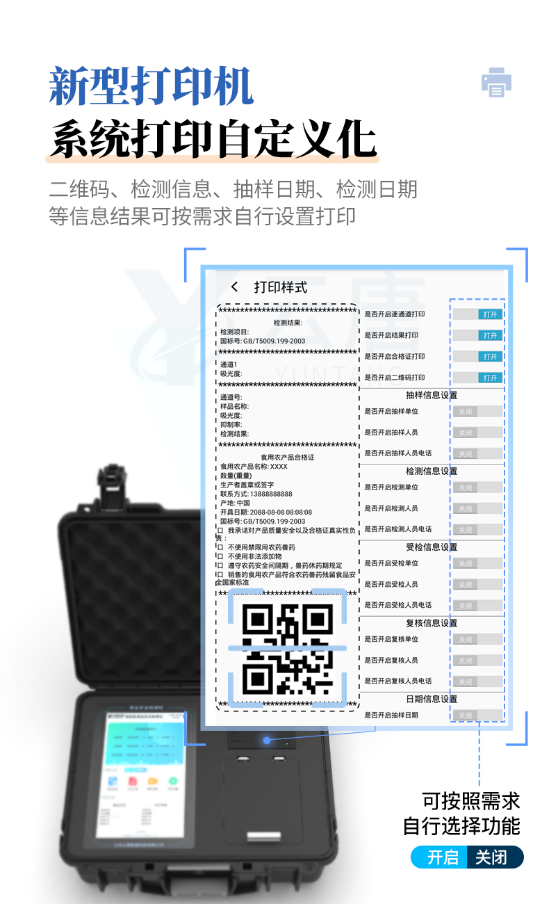 | 儀器采用手提式一體化系統(tǒng)檢測(cè)技術(shù),將分光光度模塊、膠體金檢測(cè)模塊、新型農(nóng)殘檢測(cè)模塊、數(shù)字化管理模塊、無線通訊模塊高度集成于一體,支持檢測(cè)200種食品安全檢測(cè)項(xiàng)目,同時(shí)預(yù)留升級(jí)檢測(cè)方法。 | 儀器檢測(cè)模塊標(biāo)準(zhǔn)化、智能化,檢測(cè)項(xiàng)目可隨意自由組合。檢測(cè)箱體內(nèi)置多個(gè)標(biāo)準(zhǔn)檢測(cè)單元,檢測(cè)模塊可以調(diào)整配置。 | 顯示屏幕:儀器采用10.1英寸豎向液晶觸摸屏顯,搭配運(yùn)行安卓智能操作系統(tǒng),主控芯片采用ARM Cortex-A7,RK3288/4核處理器,主頻1.88Ghz,操作方便,性能更強(qiáng)。 | 檢測(cè)通道:≥12通道;采用精密旋轉(zhuǎn)比色池設(shè)計(jì),使用同芯片同光源校準(zhǔn)精度,解決不同光源之間的誤差值,更加準(zhǔn)確**。(1-12通道間誤差0.1%,***:**202022821055.2) | 儀器光源:高精度進(jìn)口四波長冷光源,每個(gè)通道均配置 410、520、590、630nm 波長光源,標(biāo)配**的光路切換裝置,專利光路切換功能可實(shí)現(xiàn)64波長,并且所有檢測(cè)項(xiàng)目可實(shí)現(xiàn)所有通道同時(shí)檢測(cè)。 | 設(shè)備可一鍵校準(zhǔn),自動(dòng)保存校準(zhǔn)數(shù)據(jù),自動(dòng)對(duì)比校驗(yàn),得到精準(zhǔn)光源,采用Android SP存儲(chǔ)數(shù)據(jù),光源數(shù)據(jù)永不丟失,方便每一次使用。 | 通訊接口:配備無線通信模塊、4G(APN)通訊模塊、藍(lán)牙傳輸,同時(shí)具有雙USB接口以及RJ45網(wǎng)線接口,可以多方式實(shí)現(xiàn)數(shù)據(jù)保存及數(shù)據(jù)傳輸。 | 存儲(chǔ)方式:支持U盤存儲(chǔ),標(biāo)準(zhǔn)USB接口,免驅(qū)動(dòng)安裝。檢測(cè)結(jié)果存儲(chǔ)容量20萬條以上,可生成Excel表格進(jìn)行拷貝,并具有登錄保護(hù)功能。 | 智能化操作系統(tǒng):: ★操作系統(tǒng):儀器可在同一檢測(cè)界面自動(dòng)對(duì)應(yīng)相關(guān)檢測(cè)通道,一次性選擇1-12個(gè)樣品名稱,無需退出界面,節(jié)省操作時(shí)間。并可以對(duì)每個(gè)通道屬性和樣品信息單獨(dú)進(jìn)行編輯,例如送檢單位、人員,檢測(cè)人員等,打印時(shí)勾選打印顯示。 | ★數(shù)據(jù)集成系統(tǒng):設(shè)備首頁自動(dòng)匯總分析檢測(cè)數(shù)據(jù),包含:周檢測(cè)數(shù)據(jù)、月檢測(cè)數(shù)據(jù),全部檢測(cè)總數(shù)量,均包含檢測(cè)總數(shù),合格數(shù),不合格數(shù),以及相關(guān)柱形分析圖,各項(xiàng)檢測(cè)數(shù)據(jù)一目了然,無需電腦查詢,更加快捷直觀。 | ★數(shù)據(jù)庫系統(tǒng):十幾項(xiàng)數(shù)據(jù)庫分類管理儀器:包含項(xiàng)目類型、項(xiàng)目數(shù)據(jù)、檢測(cè)數(shù)據(jù)、歷史記錄、國標(biāo)信息、曲線信息、采樣信息、檢測(cè)信息、受檢信息、復(fù)核信息、圖表信息、光源校準(zhǔn)信息、打印樣式信息、樣品庫信息等等,數(shù)據(jù)庫之間互相協(xié)調(diào)聯(lián)動(dòng)保證數(shù)據(jù)的真實(shí)完整性。同時(shí)產(chǎn)品數(shù)據(jù)庫以及歷史檢測(cè)記錄支持一鍵檢索功能。 | ★限量規(guī)判系統(tǒng):具有限量查詢、添加物質(zhì)合規(guī)判定系統(tǒng)。檢測(cè)出結(jié)果后,系統(tǒng)自動(dòng)調(diào)用系統(tǒng)數(shù)據(jù)庫中相關(guān)國標(biāo)進(jìn)行比對(duì)判定,客觀顯示判定結(jié)果是否合格 | ★項(xiàng)目預(yù)設(shè)系統(tǒng):儀器具有任務(wù)預(yù)設(shè)模塊,一鍵提前預(yù)設(shè),給出方便快捷的新檢測(cè)方案,每一個(gè)任務(wù)分別可以設(shè)置不同的樣品、批次、編號(hào)、來源、備注、抽樣信息、檢測(cè)信息、受檢信息、復(fù)核信息等更多信息。樣品送檢時(shí)一鍵調(diào)取保存信息,并可多次調(diào)取,大大提高檢測(cè)效率。 | ★數(shù)據(jù)監(jiān)管系統(tǒng):同步對(duì)接監(jiān)管平臺(tái),數(shù)據(jù)可局域網(wǎng)和互聯(lián)網(wǎng)數(shù)據(jù)上傳,檢測(cè)結(jié)果可選擇直接傳至食品安全監(jiān)管平臺(tái)。進(jìn)行區(qū)域食品安全監(jiān)管及大數(shù)據(jù)分析處理與數(shù)據(jù)統(tǒng)計(jì),檢測(cè)區(qū)域食品安全長短期動(dòng)態(tài),達(dá)到食品安全問題預(yù)估、預(yù)警。 | ★打印系統(tǒng):內(nèi)置全新打印機(jī),新創(chuàng)自定義打印方式,可按需靈活勾選控制:產(chǎn)品合格證(國家農(nóng)業(yè)部標(biāo)準(zhǔn)要求),二維碼,抽樣信息、檢測(cè)信息,受檢信息、復(fù)核信息、抽樣日期、檢測(cè)日期等信息的打印。 | 供電模式:儀器交直流兩用,直流12V供電,可連接車載電源,可配6ah大容量充電鋰電池,電量可實(shí)時(shí)顯示,方便戶外流動(dòng)測(cè)試。 | 膠體金檢測(cè)模塊:采用雙通道CMOS成像處理技術(shù)及膠體金免疫層析技術(shù),可同時(shí)讀取雙膠體金卡數(shù)據(jù),自動(dòng)采集、處理分析,將檢測(cè)結(jié)果顯示,并可根據(jù)參考限值自動(dòng)判斷檢測(cè)結(jié)果,可檢測(cè)常見的獸藥殘留、生物毒素、抗生素、違禁添加物等。 | ★探測(cè)技術(shù):CMOS成像探測(cè); | ★檢測(cè)通道:1個(gè)通道; | ★檢測(cè)方式:消線法和比色法; | ★顯示模式:陰性或陽性; | ★曲線形式:軌道式掃描方式,顯示金標(biāo)卡圖像,實(shí)時(shí)生成、識(sh