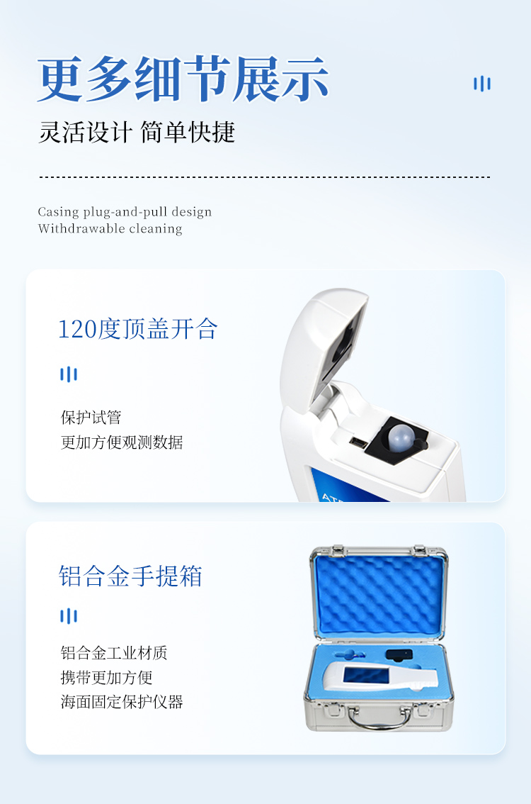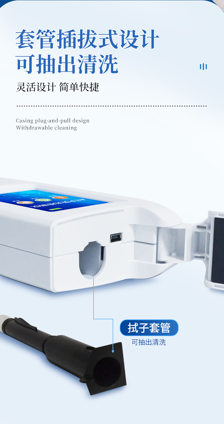 | 實用性 —— 可根據(jù)環(huán)境檢測需求設定上下限值,做到數(shù)據(jù)快速評估預警,表面潔凈度快速篩查。 | 靈敏度高 —— *************** | 速度快 —— 常規(guī)培養(yǎng)法18-24h以上,而ATP只需要十幾秒鐘 . | 可行性 —— 微生物數(shù)量與微生物體內(nèi)所含ATP有明確的相關性。 通過檢測ATP含量,可間接得出反應中微生物數(shù)量 | 可操作性 —— 傳統(tǒng)培養(yǎng)方法需要在實驗室由經(jīng)過培訓的技術人員進行操作;而ATP快速潔凈度檢測操作非常簡便,只需簡單的培訓即可由一般工作人員進行現(xiàn)場操作。 | 體驗更好 —— 試子套管采用插拔式靈活設計,可定期清洗長期使用,延長儀器壽命。 |