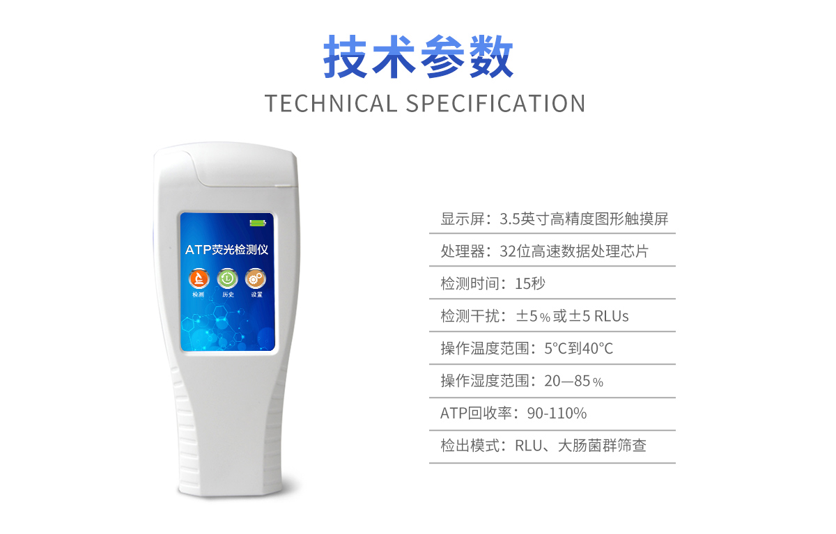 該設備為全新升級產(chǎn)品,大屏幕觸摸顯示屏,代替?zhèn)鹘y(tǒng)按鍵。操作采用生物化學反應方法檢測ATP含量,ATP熒光檢測儀基于螢火蟲發(fā)光原理,利用“熒光素酶—熒光素體系”快速檢測三磷酸腺苷(ATP)。ATP拭子含有可以裂解細胞膜的試劑,能將細胞內(nèi)ATP釋放出來,與試劑中含有的特異性酶發(fā)生反應,產(chǎn)生光,再用熒光照度計檢測發(fā)光值,微生物的數(shù)量與發(fā)光值成正比,由于所有生物活細胞中含有恒量的ATP,所以ATP含量可以清晰地表明樣品中微生物與其他生物殘余的多少,用于判斷衛(wèi)生狀況。