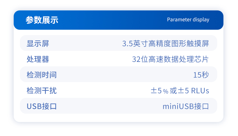 | 顯示屏:3.5英寸高精度圖形觸摸屏 | 處理器:32位高速數(shù)據(jù)處理芯片 | 檢測精度:********** | 大腸菌群:******** | 檢測范圍:*************** | 檢測時間:15秒 | 檢測干擾:±5﹪或±5 RLUs | 操作溫度范圍:5℃到40℃ | 操作濕度范圍:20—85﹪ | ATP回收率:90-110% | 檢出模式:RLU、大腸菌群篩查 | 50個用戶ID 設定 | 可設定的結(jié)果限值個數(shù):251個 | 自動判斷合格與不合格 | 自動統(tǒng)計合格率 | 內(nèi)置自校光源 | 開機30秒自檢 | 配有miniUSB接口,可將結(jié)果上傳至PC | 配備專用軟件驅(qū)動U盤代替?zhèn)鹘y(tǒng)光盤 | 儀器尺寸(W×H×D):188 mm×77mm×37mm | 使用可充電鋰電池免電池更換 | 備用狀態(tài)(20℃):6個月 | 中文操作手冊 | 穩(wěn)定的液體熒光素酶 | 潤濕的一體化采集拭子 |