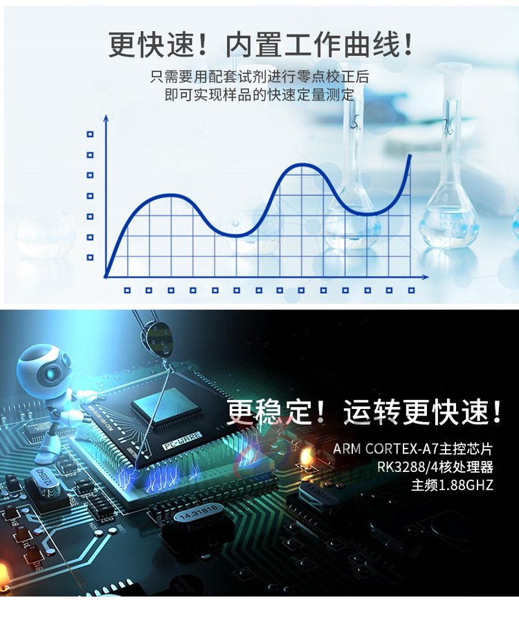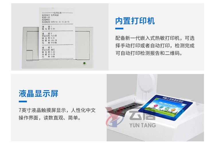 | 儀器采用臺式一體化系統檢測技術,將分光光度模塊、新型農殘檢測模塊、數字化管理模塊、無線通訊模塊高度集成于一體,支持檢測200種食品安全檢測項目,同時預留升級檢測方法。 | 儀器檢測模塊標準化、智能化,可隨意自由組合。檢測箱體內置多個標準檢測單元,檢測模塊可以調整配置。 | 儀器采用全新安卓智能系統,主控芯片采用 ARM Cortex-A7,RK3288/4核處理器,10.1寸高清液晶觸摸豎屏,更加**的UI交互界面,運轉快捷;儀器配備無線通信模塊: 4G(APN)通訊模塊、Wifi模塊,藍牙傳輸,同時具有雙USB接口以及RJ45接口能以多種方式實現數據保存和數據傳輸功能。 | 創新檢測模式: | ★檢測通道:≥12通道;采用精密旋轉比色池設計,使用同芯片同光源校準精度,解決不同光源之間的誤差值。1-12通道間誤差0.1%。(***:**202022821055.2) | ★儀器具有自動識別比色皿檢測功能,即:將樣品比色皿放入儀器后,點擊樣品檢測,儀器自動識別比色皿進行通道檢測。 | 進口高精光源: | 高精度進口四波長冷光源,通道配置 410、520、590、630nm 波長光源,一個光源芯片驅動一個光源,誤差極小,每臺設備單獨**校準光源,**比對,同時參照四種不同波段光源全方位覆蓋市面上99%的農殘食品項目檢測。 | 智能化操作系統: | 便捷操作系統:設備檢測時可在同一檢測界面自動對應相關檢測通道一次性選擇1-12個樣品名稱,無須退出界面,節省操作時間。 | 數據集成系統:設備首頁自動統計檢測數據包含:周檢測數據、月檢測數據,全部檢測總數量,均包含檢測總數,合格數,不合格數,以及相關柱形分析圖,對各項檢測數據清晰掌握,無需電腦查詢,更加快捷直觀。 | 項目預設系統:支持添加單個及多個相同或不相同的任務預設,一鍵快速調取,每一個任務分別可以設置不同的樣品、批次、編號、來源、備注、抽樣信息、檢測信息、受檢信息、復核信息等更多信息。無縫鏈接平臺和APP實時查看下發任務。 | 數據監管系統:同步對接監管平臺,數據可局域網和互聯網數據上傳,檢測結果可選擇直接傳至食品安全監管平臺。集成OSS輸出存儲服務、區分設備定向管理應用,進行區域食品安全監管及大數據分析處理與數據統計,檢測區域食品安全長短期動態,達到食品安全問題預估、預警。 | 自定義打印系統:內置全新打印系統,新創自定義打印方式,可按需靈活設置開啟或關閉:產品合格證(國家農業部標準要求),二維碼,抽樣信息、檢測信息,受檢信息、復核信息、抽樣日期、檢測日期等信息的打印。 | 系統遠程更新功能:可定向分客戶分儀器更新系統,按照不同客戶后期實際需求添加項目,無需機器返廠,即可遠程實時升級全新系統,節省時間成本及避免運輸造成設備損壞。 | 儀器主機采用一體化防水、抗壓、防撞擊、防腐蝕箱體設計,同時配備交直流供電,可連接車載電源,可選配大容量充電鋰電池,滿足現場野外檢測需求。 | 安全證書,放心保障:儀器具有中國計量科學研究院校準證書,權威認證。 |