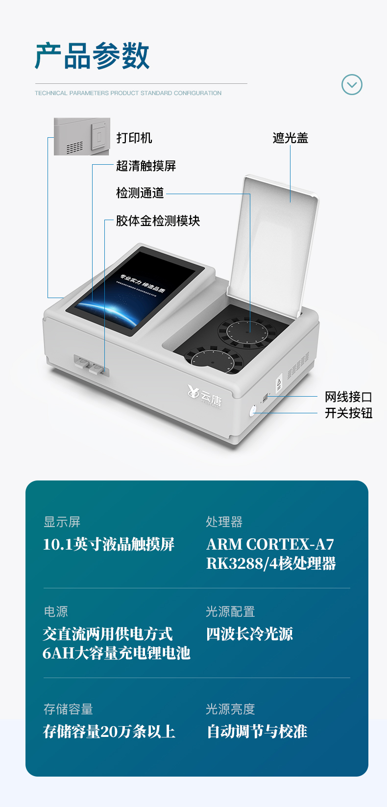 | 1、儀器采用臺式一體化系統檢測技術,將分光光度模塊、膠體金檢測模塊、新型農殘檢測模塊、數字化管理模塊、無線通訊模塊高度集成于一體,支持檢測200種食品安全檢測項目,同時預留升級檢測方法。 | 2、儀器檢測模塊標準化、智能化,檢測項目可隨意自由組合。檢測箱體內置多個標準檢測單元,檢測模塊可以調整配置。 | 3、顯示屏幕:儀器采用10.1英寸豎向液晶觸摸屏顯,搭配運行安卓智能操作系統,主控芯片采用ARM Cortex-A7,RK3288/4核處理器,主頻1.88Ghz,操作方便,性能更強。 | 4、檢測通道:≥12通道;采用精密旋轉比色池設計,使用同芯片同光源校準精度,解決不同光源之間的誤差值,更加準確**。(1-12通道間誤差0.1%,***:**202022821055.2) | 5、儀器光源:高精度進口四波長冷光源,每個通道均配置 410、520、590、630nm 波長光源,標配**的光路切換裝置,專利光路切換功能可實現64波長,并且所有檢測項目可實現所有通道同時檢測。 | 6、設備可一鍵校準,自動保存校準數據,自動對比校驗,得到精準光源,采用Android SP存儲數據,光源數據永不丟失,方便每一次使用。 | 7、通訊接口:配備無線通信模塊、4G(APN)通訊模塊、藍牙傳輸,同時具有雙USB接口以及RJ45網線接口,可以多方式實現數據保存及數據傳輸。 | 8、存儲方式:支持U盤存儲,標準USB接口,免驅動安裝。檢測結果存儲容量20萬條以上,可生成Excel表格進行拷貝,并具有登錄保護功能。 | 9、智能化操作系統: | 9.1、操作系統:儀器可在同一檢測界面自動對應相關檢測通道,一次性選擇1-12個樣品名稱,無需退出界面,節省操作時間。并可以對每個通道屬性和樣品信息單獨進行編輯,例如送檢單位、人員,檢測人員等,打印時勾選打印顯示。 | 9.2、數據集成系統:設備首頁自動匯總分析檢測數據,包含:周檢測數據、月檢測數據,全部檢測總數量,均包含檢測總數,合格數,不合格數,以及相關柱形分析圖,各項檢測數據一目了然,無需電腦查詢,更加快捷直觀。 | 9.3、數據庫系統:十幾項數據庫分類管理儀器:包含項目類型、項目數據、檢測數據、歷史記錄、國標信息、曲線信息、采樣信息、檢測信息、受檢信息、復核信息、圖表信息、光源校準信息、打印樣式信息、樣品庫信息等等,數據庫之間互相協調聯動保證數據的真實完整性。同時產品數據庫以及歷史檢測記錄支持一鍵檢索功能。 | 9.4、限量規判系統:具有限量查詢、添加物質合規判定系統。檢測出結果后,系統自動調用系統數據庫中相關國標進行比對判定,客觀顯示判定結果是否合格。 | 9.5、項目預設系統:儀器具有任務預設模塊,一鍵提前預設,給出方便快捷的新檢測方案,每一個任務分別可以設置不同的樣品、批次、編號、來源、備注、抽樣信息、檢測信息、受檢信息、復核信息等更多信息。樣品送檢時一鍵調取保存信息,并可多次調取,大大提高檢測效率。 | 9.6、數據監管系統:同步對接監管平臺,數據可局域網和互聯網數據上傳,檢測結果可選擇直接傳至食品安全監管平臺。進行區域食品安全監管及大數據分析處理與數據統計,檢測區域食品安全長短期動態,達到食品安全問題預估、預警。 | 9.7.1、全新打印系統:內置全新打印機,新創自定義打印方式,可按需靈活勾選控制:產品合格證(國家農業部標準要求),二維碼,抽樣信息、檢測信息,受檢信息、復核信息、抽樣日期、檢測日期等信息的打印。 | 9.7.2、A4紙版本報告打印功能(選配):設備擁有兩種結果展示方式,可以自動生成A4打印模板和小票打印模板兩種樣式,可通過WiFi及網線等方式鏈接外置打印機可進行打印。 | 10、供電模式:儀器交直流兩用,直流12V供電,可連接車載電源,可配6ah大容量充電鋰電池,電量可實時顯示,方便戶外流動測試。 | 11、膠體金檢測模塊:采用單通道CMOS成像處理技術及膠體金免疫層析技術,可讀取膠體金卡數據,自動采集、處理分析,將檢測結果顯示,并可根據參考限值自動判斷檢測結果,可檢測常見的獸藥殘留、生物毒素、抗生素、違禁添加物等。 | 11.1、探測技術:CMOS成像探測; | 11.2、檢測通道:1個通道; | 11.3、檢測方式:消線法和比色法; | 11.4、顯示模式:陰性或陽性; | 11.5、曲線形式:直插式掃描方式,顯示金標卡圖像,實時生成、識別CT曲線圖,無需手動調整,完成檢測后自動退出檢測卡。兼容市場上其他金標卡,使用耗材不受限制。 | 12、儀器具備遠程升級功能,可定向分客戶分儀器更新,開機后自動更新,并可持續性免費更新系統版本,無需像傳統產品返廠更新,節省時間及人力成本并避免了物流運輸返廠升級導致設備損壞的潛在風險。 |