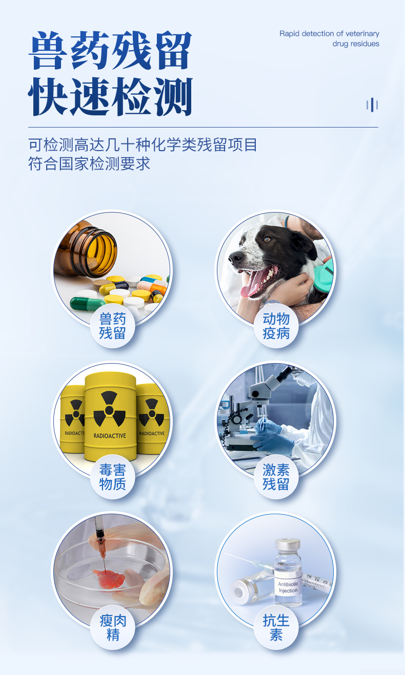 山東云唐智能科技有限公司生產(chǎn)的瘦肉精檢測(cè)儀可現(xiàn)場(chǎng)快速檢測(cè)鹽酸克倫特羅、萊克多巴胺、沙丁胺醇、己烯雌酚、喹乙醇等。儀器預(yù)留其他項(xiàng)目檢測(cè)程序和端口,根據(jù)日后需求可進(jìn)行遠(yuǎn)程設(shè)備升級(jí)。日后可升級(jí)為檢測(cè)抗生素、獸藥殘留、動(dòng)物疫病等檢測(cè)項(xiàng)目的綜合類型儀器。