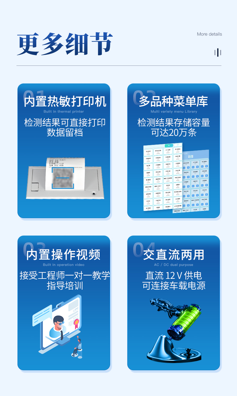 | 1、儀器采用10.1英寸液晶觸摸屏顯,搭配運(yùn)行安卓智能操作系統(tǒng),主控芯片采用ARM Cortex-A7,RK3288/4核處理器,主頻1.88Ghz,運(yùn)轉(zhuǎn)速度更快速,性能更強(qiáng)。 | 2、儀器功能包括:膠體金檢測(cè)模塊、數(shù)字化管理模塊、無(wú)線通訊模塊等,可以滿足同一軟件下實(shí)現(xiàn)所有檢測(cè)項(xiàng)目的檢測(cè),并在同一窗口展示檢測(cè)結(jié)果。 | 3.一體化臺(tái)式快檢設(shè)備,采用交直流兩用供電方式,可連接車載電源,配備6ah大容量充電鋰電池,可以滿足現(xiàn)場(chǎng)及流動(dòng)檢測(cè)使用的需求。儀器尺寸:43×35×20cm, 主機(jī)凈重:5.1kg | 4、系統(tǒng)自帶數(shù)據(jù)集成模塊,設(shè)備首頁(yè)自動(dòng)統(tǒng)計(jì)檢測(cè)數(shù)據(jù)包含:周檢測(cè)數(shù)據(jù)、月檢測(cè)數(shù)據(jù),全部檢測(cè)總數(shù)量,均包含檢測(cè)總數(shù),合格數(shù),不合格數(shù),以及相關(guān)柱形分析圖,對(duì)各項(xiàng)檢測(cè)數(shù)據(jù)清晰掌握,無(wú)需電腦查詢,更加快捷直觀。 | 5、儀器具有任務(wù)預(yù)設(shè)模塊,可在樣品送檢前提前預(yù)設(shè)樣品名稱、檢測(cè)指標(biāo)、送檢單位等信息,樣品送檢時(shí)一鍵調(diào)取保存信息,檢測(cè)更加方便快捷。 | 6、膠體金檢測(cè)模塊: | 直插式自動(dòng)掃描方式,可實(shí)時(shí)顯示金標(biāo)卡實(shí)時(shí)圖像,系統(tǒng)自動(dòng)分析并呈現(xiàn)出CT曲線圖,CT線自動(dòng)識(shí)別,無(wú)需手動(dòng)調(diào)整,完成檢測(cè)后自動(dòng)退出檢測(cè)卡。 | 結(jié)果判定線可修改,對(duì)照值標(biāo)定值可保存,斷電不丟失數(shù)據(jù)。 | 兼容市場(chǎng)上其他膠體金卡,使用耗材不受限制,極大增強(qiáng)用戶使用體驗(yàn)。 | 7、儀器檢測(cè)系統(tǒng)擁有龐大數(shù)據(jù)庫(kù),并且構(gòu)建了完善的檢索、修訂功能。食品庫(kù)涵蓋多種樣品名稱,可按需添加或刪除、編輯樣品名稱;產(chǎn)品數(shù)據(jù)庫(kù)以及歷史檢測(cè)記錄支持一鍵檢索功能。 | 8、系統(tǒng)打印自定義化,打印格式多樣化,產(chǎn)品合格證(國(guó)家標(biāo)準(zhǔn)要求),二維碼,抽樣信息、檢測(cè)信息,受檢信息、復(fù)核信息、抽樣日期、檢測(cè)日期等信息結(jié)果,可按需求自行設(shè)置打印內(nèi)容。 | 9、A4紙版本報(bào)告打印功能(可選配):設(shè)備擁有兩種結(jié)果展示方式,可以自動(dòng)生成A4打印模板和小票打印模板兩種樣式,可通過(guò)WiFi及網(wǎng)線等方式鏈接外置打印機(jī)可進(jìn)行打印 | 10、儀器具有 wifi 聯(lián)網(wǎng)上傳、RJ45網(wǎng)線連接功能,可以快速上傳數(shù)據(jù)。同步對(duì)接監(jiān)管平臺(tái),數(shù)據(jù)可局域網(wǎng)和互聯(lián)網(wǎng)數(shù)據(jù)上傳,檢測(cè)結(jié)果直接傳至食品安全監(jiān)管平臺(tái)。進(jìn)行區(qū)域食品安全監(jiān)管及大數(shù)據(jù)分析處理與數(shù)據(jù)統(tǒng)計(jì),檢測(cè)區(qū)域食品安全長(zhǎng)短期動(dòng)態(tài),達(dá)到食品安全問(wèn)題預(yù)估、預(yù)警。 | 11、設(shè)備支持U盤(pán)存儲(chǔ),標(biāo)準(zhǔn)USB接口,免驅(qū)動(dòng)安裝。檢測(cè)結(jié)果存儲(chǔ)容量20萬(wàn)條以上,可生成Excel表格,進(jìn)行一鍵拷貝,并具有登錄保護(hù)功能,可設(shè)置用戶名及密碼,規(guī)范不同人員操作權(quán)限,防止非工作人員操作,并且可以進(jìn)行重新校準(zhǔn)、鎖定、恢復(fù)出廠設(shè)置功能。儀器固件可升級(jí),后期檢測(cè)項(xiàng)目可擴(kuò)充。 | 12、儀器具備遠(yuǎn)程升級(jí)功能,可定向分客戶分儀器更新,開(kāi)機(jī)后自動(dòng)更新,并可持續(xù)性免費(fèi)更新系統(tǒng)版本,無(wú)需像傳統(tǒng)產(chǎn)品返廠更新,節(jié)省時(shí)間及人力成本并避免了物流運(yùn)輸返廠升級(jí)導(dǎo)致設(shè)備損壞的潛在風(fēng)險(xiǎn)。 |