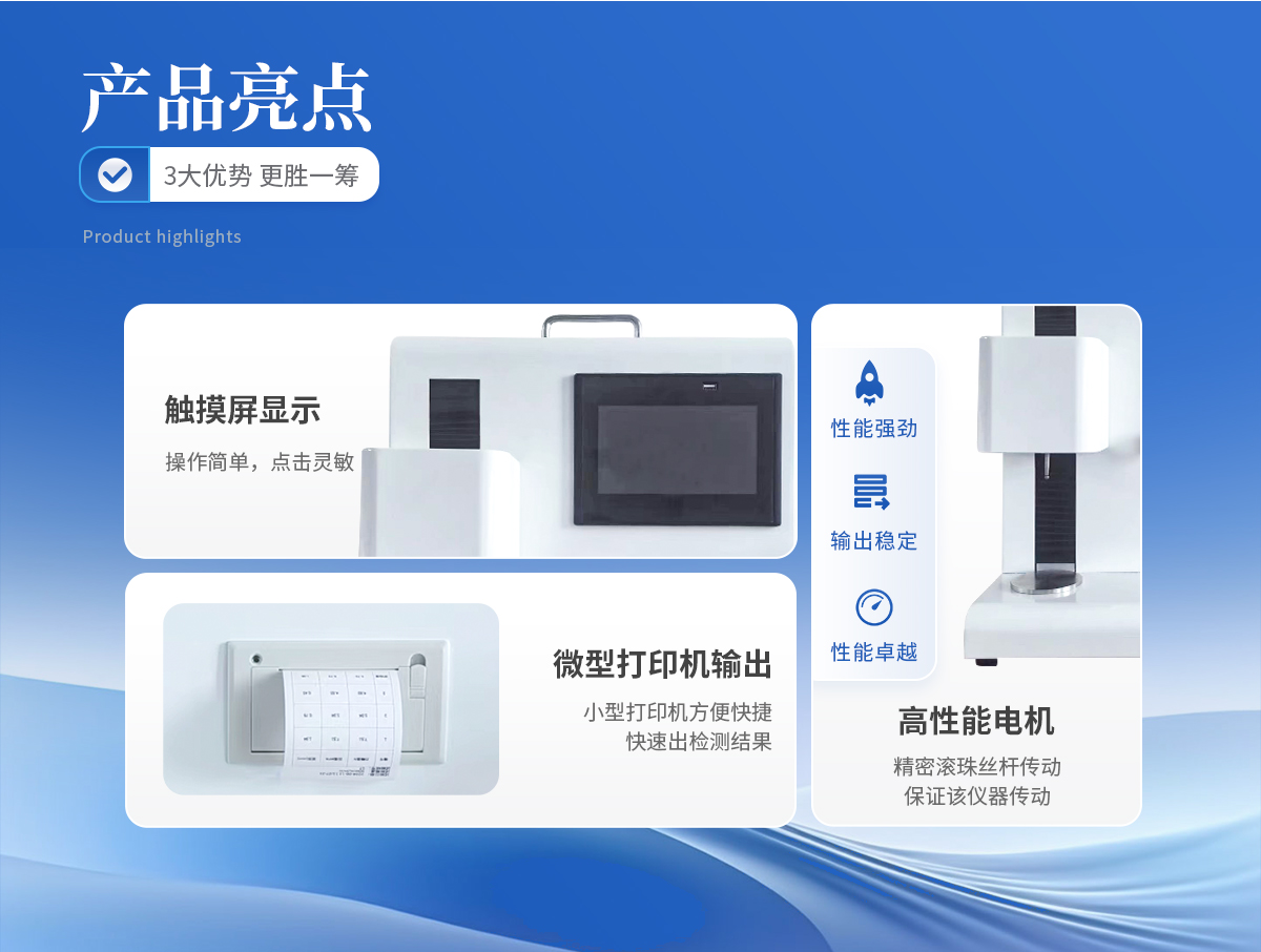 | 1、采用芯片控制,高精度測力傳感器,精度高。 | 2、采用高性能電機,滾珠絲桿傳動,保證該儀器傳動。 | 3、大觸摸屏中文顯示,友好人機界面操作。全自動完成測試。操作方便,具有測試數據統計處理功能,微型打印機輸出。 |