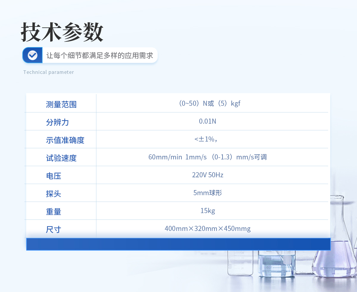 | 測量范圍:(0~50)N或(5)kgf | 分辨力:0.01N | 示值準確度:<±1% | 試驗速度:60mm/min 1mm/s (0-1.3)mm/s可調 | 電壓:220V 50Hz | 探頭:5mm球形 | 單位:g.cm | 重量:15kg | 尺寸:400mm×320mm×450mm |