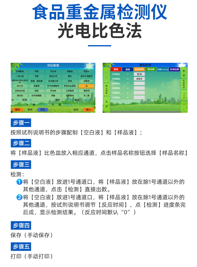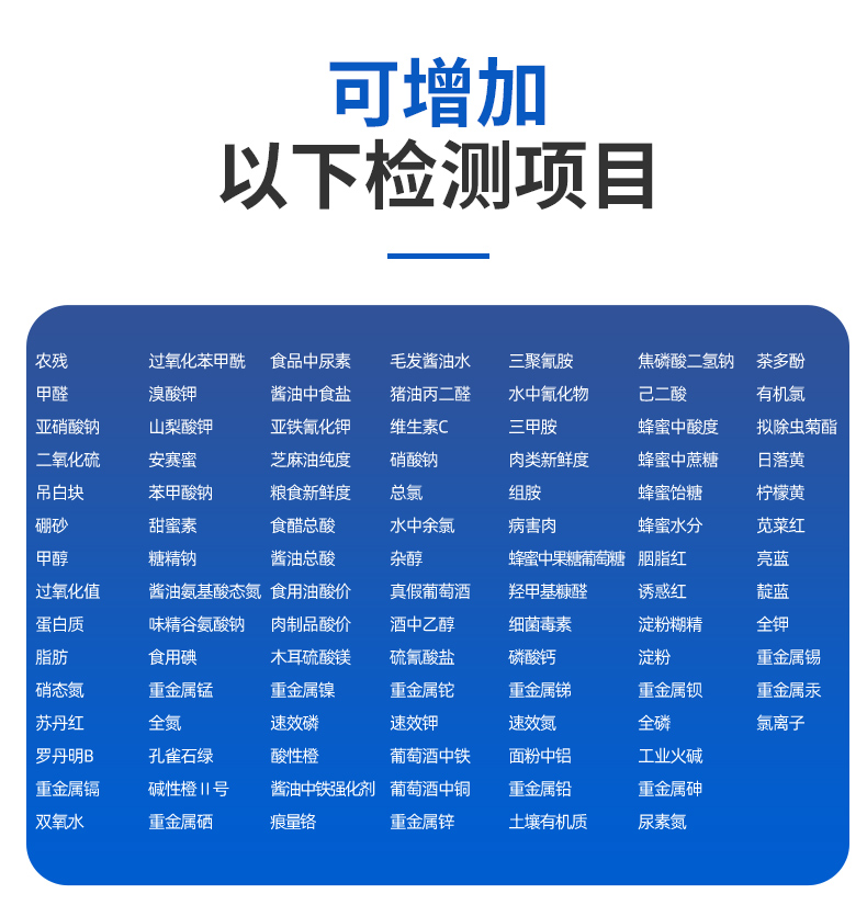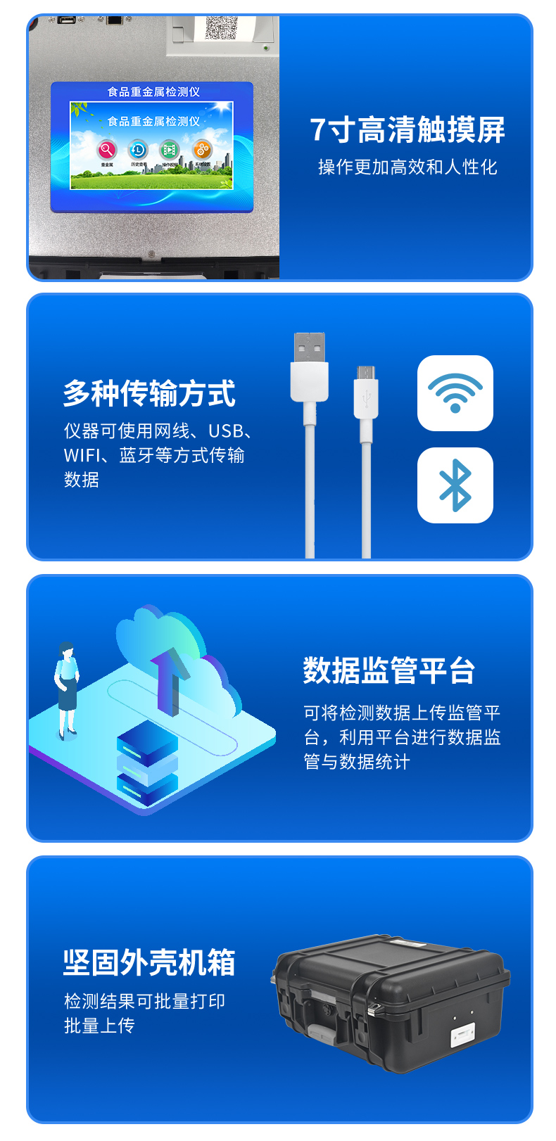 儀器采用臺(tái)式一體化系統(tǒng)檢測技術(shù),將分光光度模塊、新型農(nóng)殘檢測模塊、數(shù)字化管理模塊、無線通訊模塊高度集成于一體,支持檢測200種食品安全檢測項(xiàng)目,同時(shí)預(yù)留升級檢測方法。儀器檢測模塊標(biāo)準(zhǔn)化、智能化,可隨意自由組合。檢測箱體內(nèi)置多個(gè)標(biāo)準(zhǔn)檢測單元,檢測模塊可以調(diào)整配置。儀器采用全新安卓智能系統(tǒng),主控芯片采用 ARM Cortex-A7,RK3288/4核處理器,10.1寸高清液晶觸摸豎屏,更加**的UI交互界面,運(yùn)轉(zhuǎn)快捷;儀器配備無線通信模塊: 4G(APN)通訊模塊、Wifi模塊,藍(lán)牙傳輸,同時(shí)具有雙USB接口以及RJ45接口能以多種方式實(shí)現(xiàn)數(shù)據(jù)保存和數(shù)據(jù)傳輸功能。創(chuàng)新檢測模式:★檢測通道:≥12通道;采用精密旋轉(zhuǎn)比色池設(shè)計(jì),使用同芯片同光源校準(zhǔn)精度,解決不同光源之間的誤差值。1-12通道間誤差0.1%。(***:**202022821055.2)★儀器具有自動(dòng)識(shí)別比色皿檢測功能,即:將樣品比色皿放入儀器后,點(diǎn)擊樣品檢測,儀器自動(dòng)識(shí)別比色皿進(jìn)行通道檢測。進(jìn)口高精光源:高精度進(jìn)口四波長冷光源,通道配置 410、520、590、630nm 波長光源,一個(gè)光源芯片驅(qū)動(dòng)一個(gè)光源,誤差極小,每臺(tái)設(shè)備單獨(dú)**校準(zhǔn)光源,**比對,同時(shí)參照四種不同波段光源全方位覆蓋市面上99%的農(nóng)殘食品項(xiàng)目檢測。智能化操作系統(tǒng):便捷操作系統(tǒng):設(shè)備檢測時(shí)可在同一檢測界面自動(dòng)對應(yīng)相關(guān)檢測通道一次性選擇1-12個(gè)樣品名稱,無須退出界面,節(jié)省操作時(shí)間。數(shù)據(jù)集成系統(tǒng):設(shè)備首頁自動(dòng)統(tǒng)計(jì)檢測數(shù)據(jù)包含:周檢測數(shù)據(jù)、月檢測數(shù)據(jù),全部檢測總數(shù)量,均包含檢測總數(shù),合格數(shù),不合格數(shù),以及相關(guān)柱形分析圖,對各項(xiàng)檢測數(shù)據(jù)清晰掌握,無需電腦查詢,更加快捷直觀。項(xiàng)目預(yù)設(shè)系統(tǒng):支持添加單個(gè)及多個(gè)相同或不相同的任務(wù)預(yù)設(shè),一鍵快速調(diào)取,每一個(gè)任務(wù)分別可以設(shè)置不同的樣品、批次、編號(hào)、來源、備注、抽樣信息、檢測信息、受檢信息、復(fù)核信息等更多信息。無縫鏈接平臺(tái)和APP實(shí)時(shí)查看下發(fā)任務(wù)。數(shù)據(jù)監(jiān)管系統(tǒng):同步對接監(jiān)管平臺(tái),數(shù)據(jù)可局域網(wǎng)和互聯(lián)網(wǎng)數(shù)據(jù)上傳,檢測結(jié)果可選擇直接傳至食品安全監(jiān)管平臺(tái)。集成OSS輸出存儲(chǔ)服務(wù)、區(qū)分設(shè)備定向管理應(yīng)用,進(jìn)行區(qū)域食品安全監(jiān)管及大數(shù)據(jù)分析處理與數(shù)據(jù)統(tǒng)計(jì),檢測區(qū)域食品安全長短期動(dòng)態(tài),達(dá)到食品安全問題預(yù)估、預(yù)警。自定義打印系統(tǒng):內(nèi)置全新打印系統(tǒng),新創(chuàng)自定義打印方式,可按需靈活設(shè)置開啟或關(guān)閉:產(chǎn)品合格證(國家農(nóng)業(yè)部標(biāo)準(zhǔn)要求),二維碼,抽樣信息、檢測信息,受檢信息、復(fù)核信息、抽樣日期、檢測日期等信息的打印。系統(tǒng)遠(yuǎn)程更新功能:可定向分客戶分儀器更新系統(tǒng),按照不同客戶后期實(shí)際需求添加項(xiàng)目,無需機(jī)器返廠,即可遠(yuǎn)程實(shí)時(shí)升級全新系統(tǒng),節(jié)省時(shí)間成本及避免運(yùn)輸造成設(shè)備損壞。儀器主機(jī)采用一體化防水、抗壓、防撞擊、防腐蝕箱體設(shè)計(jì),同時(shí)配備交直流供電,可連接車載電源,可選配大容量充電鋰電池,滿足現(xiàn)場野外檢測需求。安全證書,放心保障:儀器具有中國計(jì)量科學(xué)研究院校準(zhǔn)證書,權(quán)威認(rèn)證。