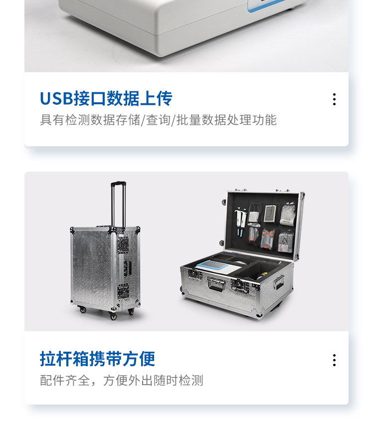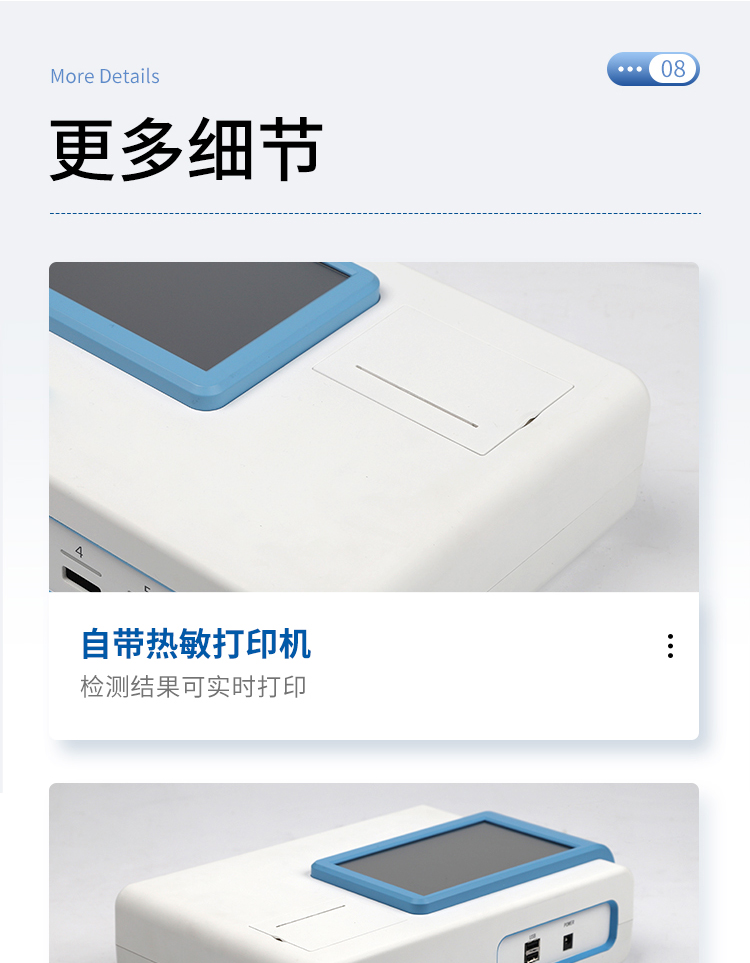 | 一體化設(shè)計,集成孵育和檢測功能同時進行,孵育完成直接檢測; | 全中文 7英寸高清液晶顯示,觸摸屏操作; | Android 系統(tǒng),支持在線升級,可WIFI聯(lián)網(wǎng); | 檢測原理:熒光定量免疫層析法; | 6通道設(shè)計,可同時進行一種或多種指標的檢測,6個獨立檢測單元,檢測效率高,并且互不干擾; | 具有二維碼自動識別系統(tǒng),可直接識別檢測項目、檢測流程等信息; | 儀器自帶熱敏打印機,檢測結(jié)果可實時打印; | 具有檢測數(shù)據(jù)存儲(存儲數(shù)量不少于 10000 條)、查詢、批量數(shù)據(jù)處理和打印功能; | 儀器≥2 個USB 接口,可拷貝結(jié)果及原始數(shù)據(jù),具有 wifi 接入模塊,可通過無線連接網(wǎng) 絡(luò)實現(xiàn)數(shù)據(jù)上傳; | 分鐘內(nèi)達到工作狀態(tài)(37℃),封閉系統(tǒng),不受外界環(huán)境(光、熱)干擾,工作環(huán)境溫度:0-30℃; | 相對極差≤10%; | 重復(fù)性 CV≤1%; | 批間變異≤3%; | 尺寸310x210x93mm |