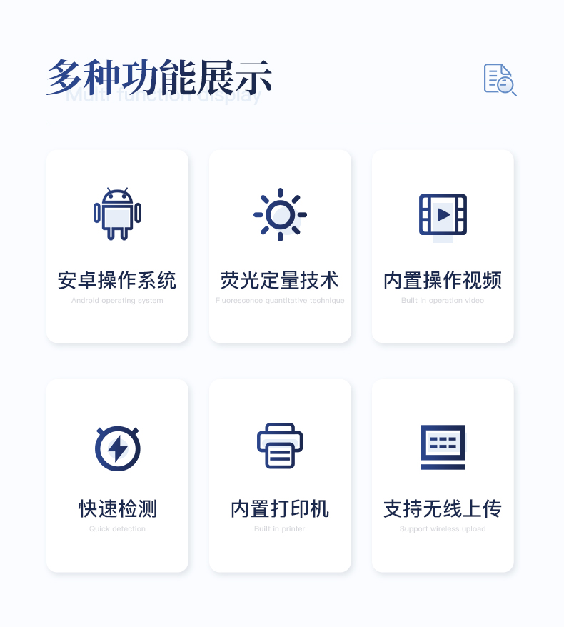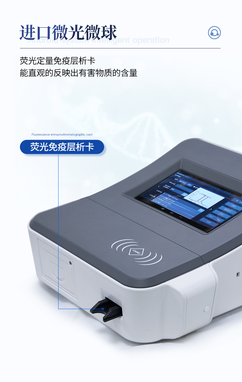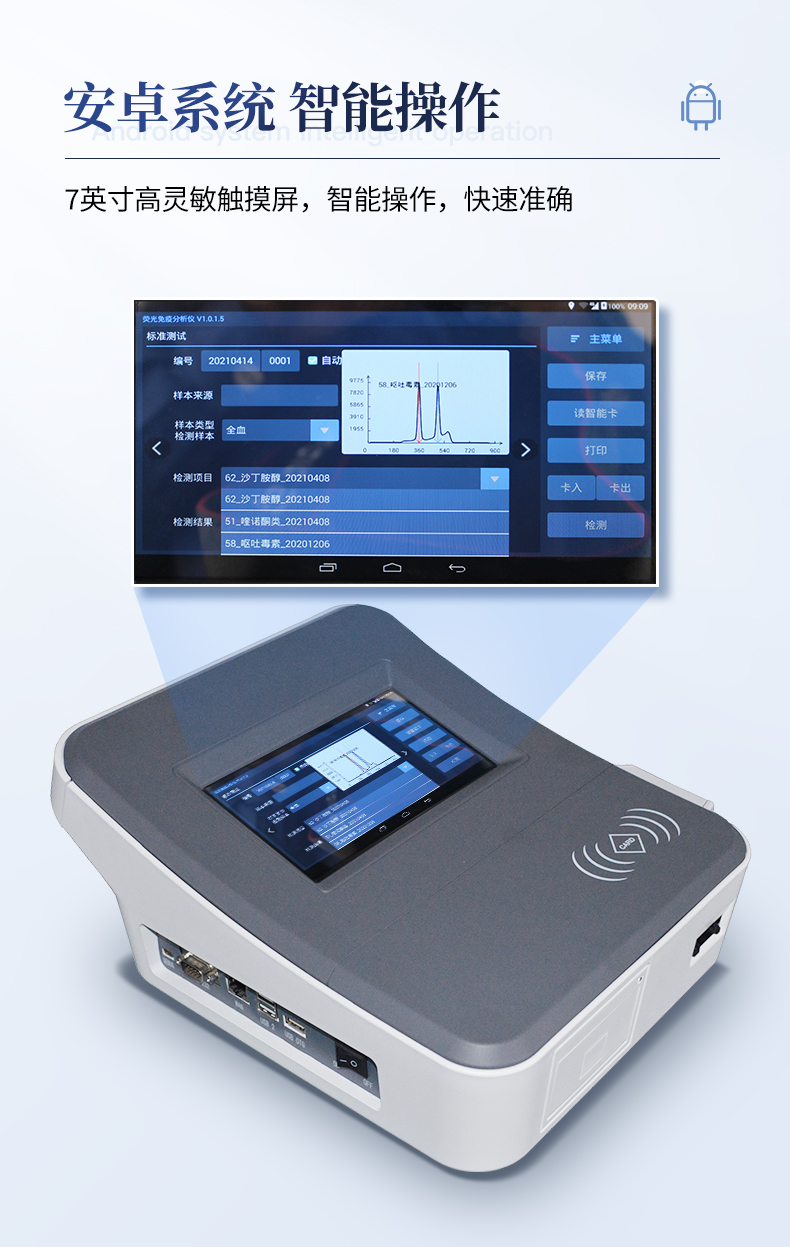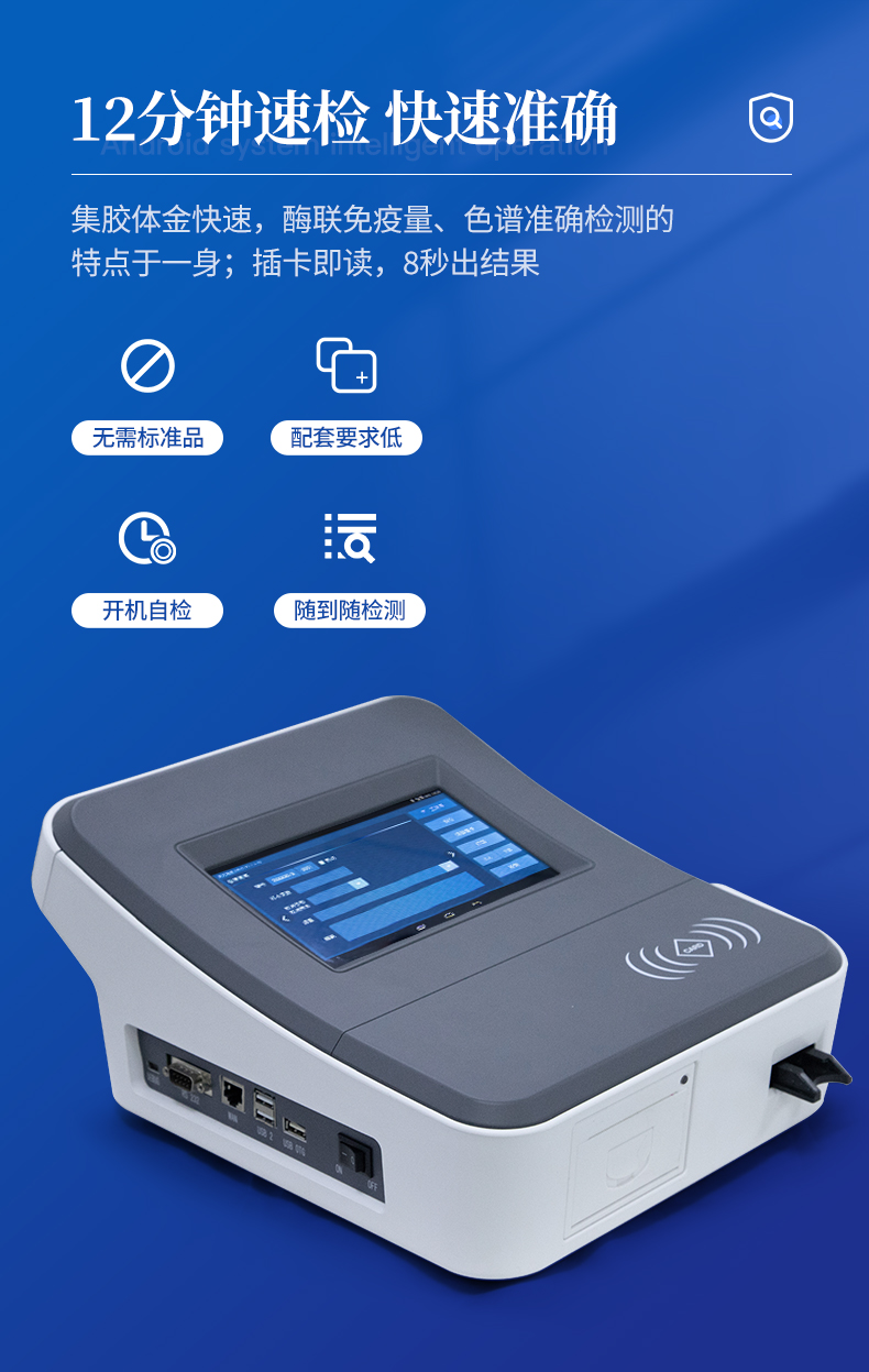 1、儀器自動識別檢測卡條形碼上的檢測項目、樣本類型、檢測限、標準曲線,形成完整的檢測數據信息鏈。一卡一控,插卡后儀器自動讀取檢測卡顯示的C、T線的熒光信號,依據檢測卡內置的標準曲線,自動計算結果;用戶可根據自身需求,選擇設定檢測限/定量限(內控或國家標準限量)。2、檢測數據信息采集項目(包括但不限于):儀器至少支持以下檢測數據采集:①檢測項目;②樣本類型;③檢測樣本;④國家限量;⑤檢測者;⑥檢測單位;⑦檢測時間;⑧檢測線/定量限;⑨檢測編號;⑩內控限量 樣本來源等,并支持數據采集項目遠程擴展升級。3、檢測數據采集方式:檢測數據信息采集項目中載明的:①-⑨項為儀器自動識別采集,⑩項為手寫輸入。4、檢測數據上傳方式:完成檢測后,儀器能自動將檢測數據信息采集項目載明的全部檢測數據信息上傳至檢測監管系統平臺。5、接口:藍牙通訊接口;內置無線WIFI,檢測數據實時傳輸到數據監管平臺,客戶可通過賬號登陸在網絡上實時查看檢測數據6、存儲空間:存儲空間16GB。7、信息輸入:支持中英文手寫輸入。8、本機數據管理:具有檢測數據存儲、查詢,批量數據刪除和打印等功能。9、檢測項目管理:儀器支持檢測項目及對應國家限量遠程增加、刪除等維護管理。10、操作權限管理:儀器支持檢測操作人員使用賬號、密碼登陸儀器的功能,支持賬號、密碼在監管系統平臺進行驗證。11、在線學習:內置檢測項目操作流程簡圖,教學軟件可實時在線更新。12、工作溫度:5-40℃,相對濕度:10%-90%。電源電壓220V±22V,頻率50Hz±1Hz,額定功率40W,與電源的連接方式:可拆卸電源線。13、恒溫孵育器(1)適用于定量膠體金試紙卡和反應液體準確控溫反應,以提高準確性;(2)孵育器卡槽數6個,每個卡槽時間獨立控制;(3)插入卡條后自動倒計時,倒計時結束自動報警,并記錄超時時間;(4)內部恒溫控制,控溫溫度:37℃,控溫精度≤0.5℃,升溫速度≤8min,溫度均勻性≤0.3℃,實時溫度顯示精度:0.1℃。