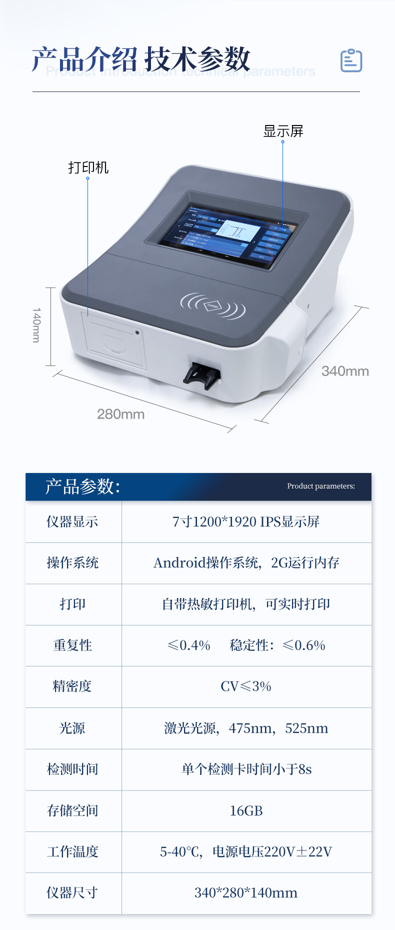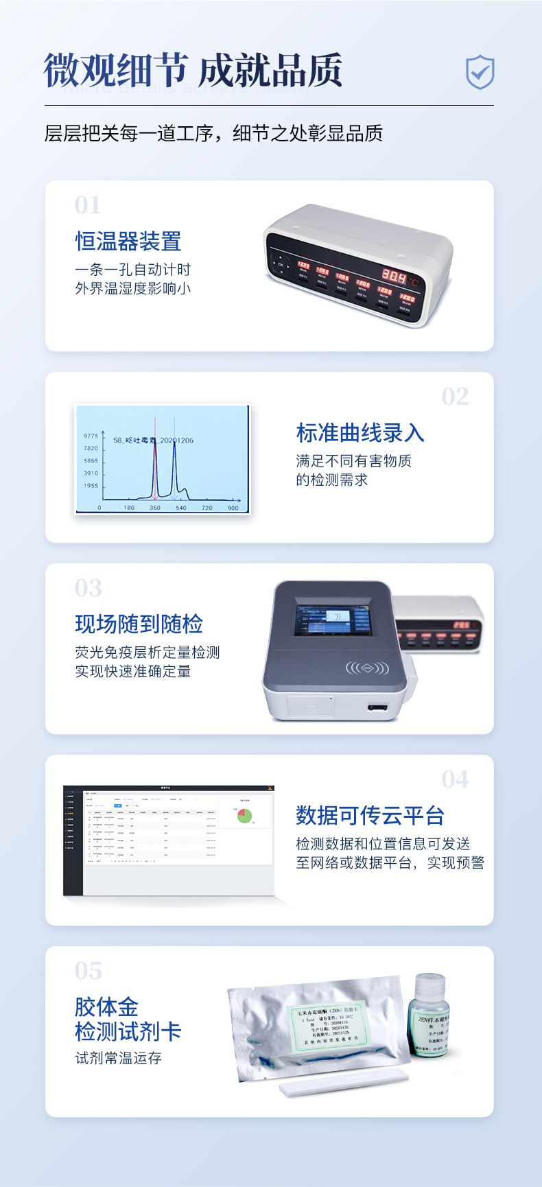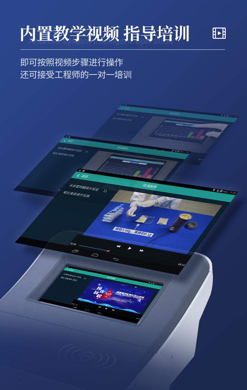 1、儀器自動識別檢測卡條形碼上的檢測項目、樣本類型、檢測限、標準曲線,形成完整的檢測數據信息鏈。一卡一控,插卡后儀器自動讀取檢測卡顯示的C、T線的熒光信號,依據檢測卡內置的標準曲線,自動計算結果;用戶可根據自身需求,選擇設定檢測限/定量限(內控或國家標準限量)。2、檢測數據信息采集項目(包括但不限于):儀器至少支持以下檢測數據采集:①檢測項目;②樣本類型;③檢測樣本;④國家限量;⑤檢測者;⑥檢測單位;⑦檢測時間;⑧檢測線/定量限;⑨檢測編號;⑩內控限量 樣本來源等,并支持數據采集項目遠程擴展升級。3、檢測數據采集方式:檢測數據信息采集項目中載明的:①-⑨項為儀器自動識別采集,⑩項為手寫輸入。4、檢測數據上傳方式:完成檢測后,儀器能自動將檢測數據信息采集項目載明的全部檢測數據信息上傳至檢測監管系統平臺。5、接口:藍牙通訊接口;內置無線WIFI,檢測數據實時傳輸到數據監管平臺,客戶可通過賬號登陸在網絡上實時查看檢測數據6、存儲空間:存儲空間16GB。7、信息輸入:支持中英文手寫輸入。8、本機數據管理:具有檢測數據存儲、查詢,批量數據刪除和打印等功能。9、檢測項目管理:儀器支持檢測項目及對應國家限量遠程增加、刪除等維護管理。10、操作權限管理:儀器支持檢測操作人員使用賬號、密碼登陸儀器的功能,支持賬號、密碼在監管系統平臺進行驗證。11、在線學習:內置檢測項目操作流程簡圖,教學軟件可實時在線更新。12、工作溫度:5-40℃,相對濕度:10%-90%。電源電壓220V±22V,頻率50Hz±1Hz,額定功率40W,與電源的連接方式:可拆卸電源線。13、恒溫孵育器(1)適用于定量膠體金試紙卡和反應液體準確控溫反應,以提高準確性;(2)孵育器卡槽數6個,每個卡槽時間獨立控制;(3)插入卡條后自動倒計時,倒計時結束自動報警,并記錄超時時間;(4)內部恒溫控制,控溫溫度:37℃,控溫精度≤0.5℃,升溫速度≤8min,溫度均勻性≤0.3℃,實時溫度顯示精度:0.1℃。