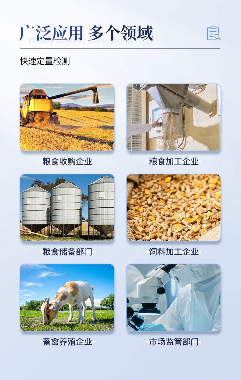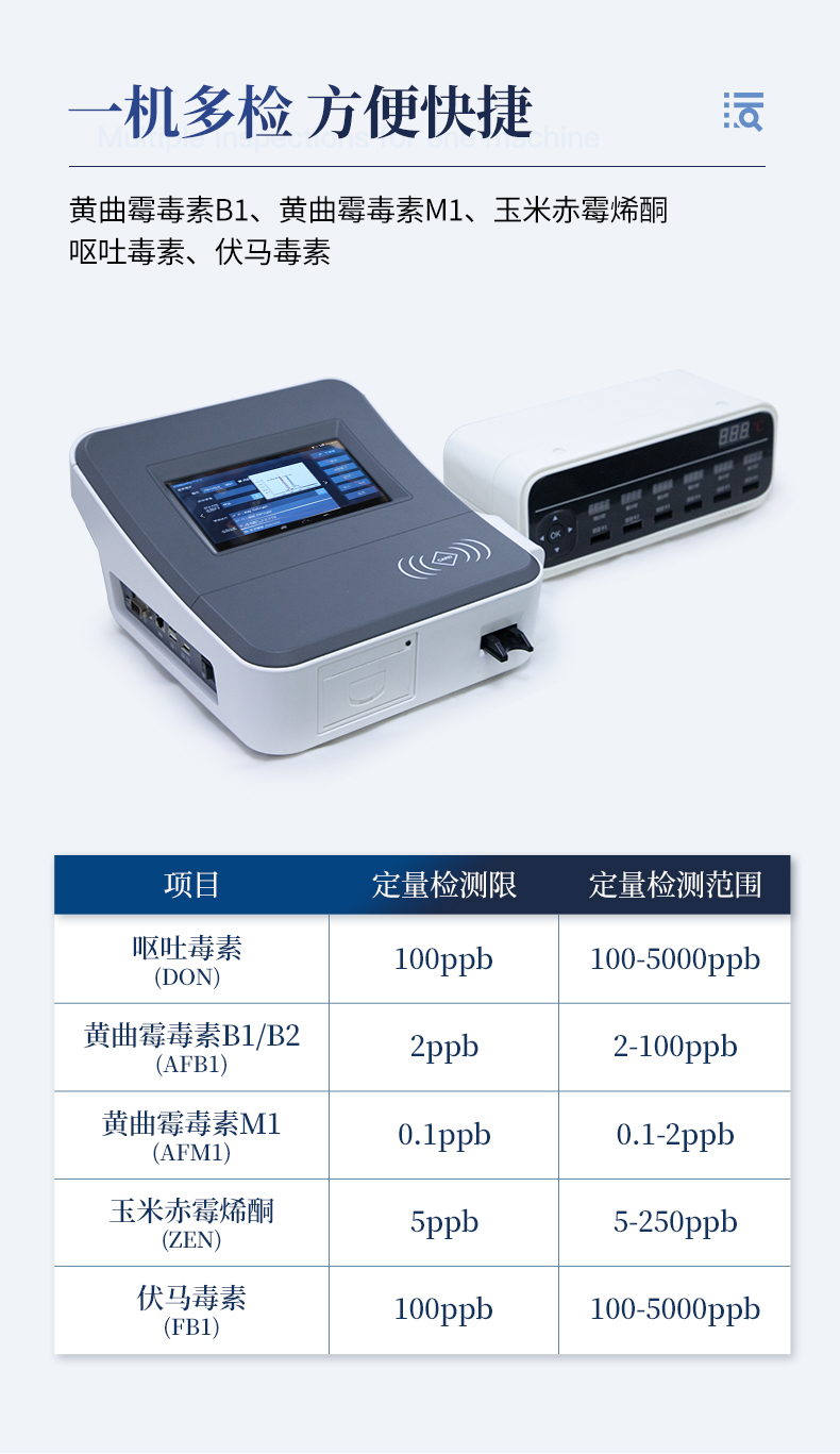 真菌毒素熒光定量分析儀可快速檢測糧食、飼料、谷物、食用油、調味品中如玉米、大米、小麥、大麥、糙米、麩皮、稻谷、豆粕、米糠、飼料中的黃曲霉毒素B1、黃曲霉毒素M1、玉米赤霉烯酮、嘔吐毒素、伏馬毒素,杜絕毒素污染,維護食品安全。